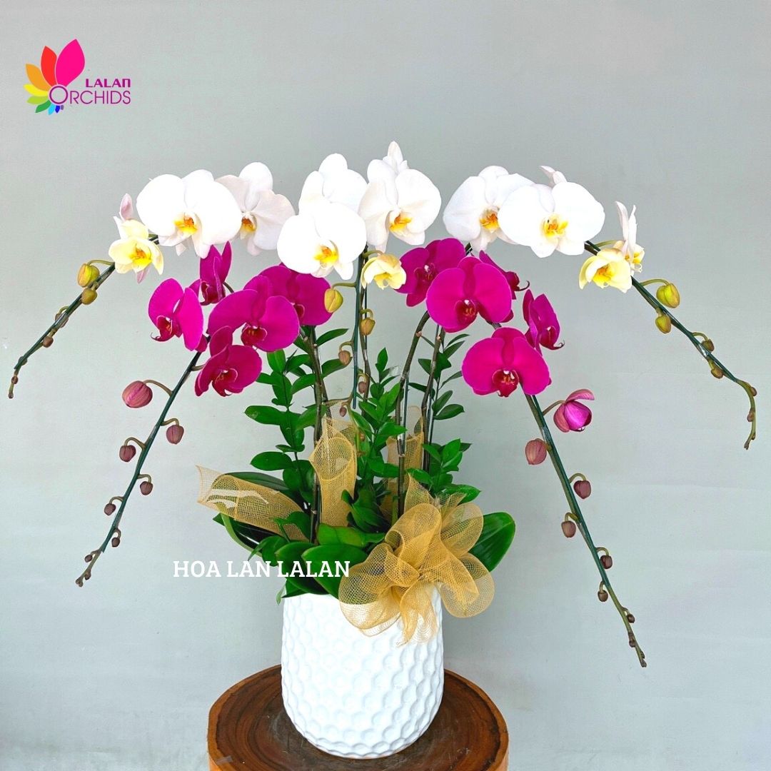 Chậu lan hồ điệp được ghép từ 5 cành lan trắng tím do các nghệ nhân của Hoa lan Lalan ghép xen kẽ một cách hài hòa, nghệ thuật tạo nên chậu hoa lan đẹp sang trọng, quý phái và tinh tế.