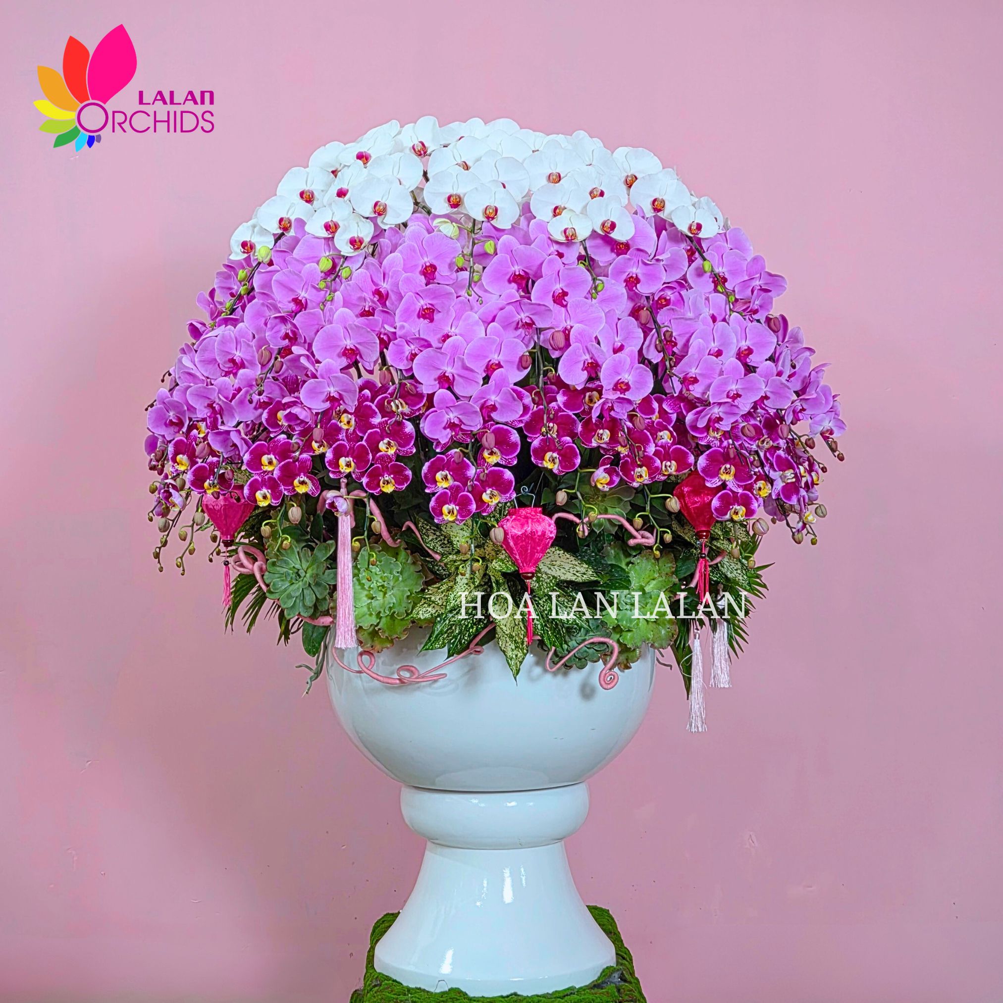 Chậu hoa lan hồ điệp phối màu trắng tím hồng 60 cành xoay tròn nổi bật với sự sang trọng, tinh tế và đẳng cấp. Sự hòa quyện màu sắc hài hòa cùng dáng cắm tròn đều giúp chậu hoa luôn đẹp từ mọi góc nhìn, phù hợp những không gian trang trọng như sảnh công ty, phòng khách lớn hay quầy lễ tân. Từng cành lan hồ điệp được Hoa lan Lalan tuyển chọn kỹ lưỡng, bông to, cánh dày, sắc hoa bền đẹp, thể hiện chất lượng cao cấp xứng tầm.