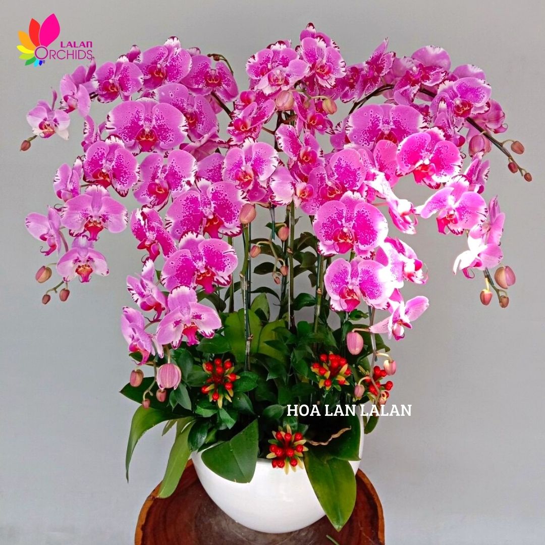 Chậu hoa lan hồ điệp 8 cành đột biến mang một màu sắc vô cùng độc đáo được các nghệ nhân cắm hoa thiết kế và phối hợp cho ra một sản phẩm vô cùng tuyệt đẹp và sang trọng.