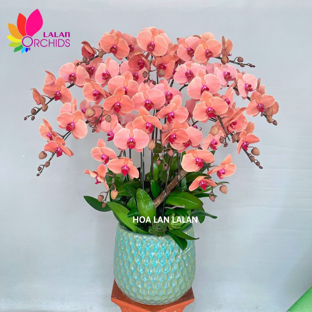 Lan hồ điệp cam 10 cành ghép từ những cành hoa lan hồ điệp chất lượng loại A với đặc điểm bông to, cành dài, siêu bền, được các nghệ nhân của Hoa lan Lalan ghép xen kẽ một cách hài hòa, nghệ thuật tạo nên chậu hoa lan đẹp sang trọng, quý phái và tinh tế.
