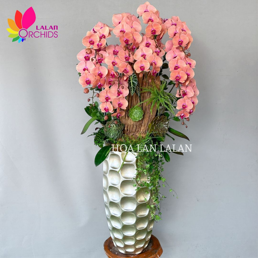 Chậu lan hồ điệp cam ghép lũa mang màu sắc tinh tế, kết hợp vẻ đẹp thanh tao của lan hồ điệp và tính nghệ thuật của gỗ lũa. Chậu lan hồ điệp cam nổi bật với màu rắc rực rỡ, những cành lan hồ điệp loại 1 được chọn lọc kỹ lưỡng. Lan hồ điệp cam sọc giống Đài Loan chất lượng cao, đảm bảo hoa to, màu sắc rực rỡ, và độ bền vượt trội.