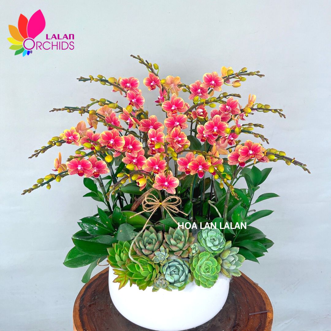 Lan hồ điệp mini cam ghép từ 8 cây lan mini kết hợp cùng sen đá tạo nên chậu hoa lan đẹp sang trọng, quý phái và tinh tế, sẽ làm cuốn hút mọi ánh nhìn.