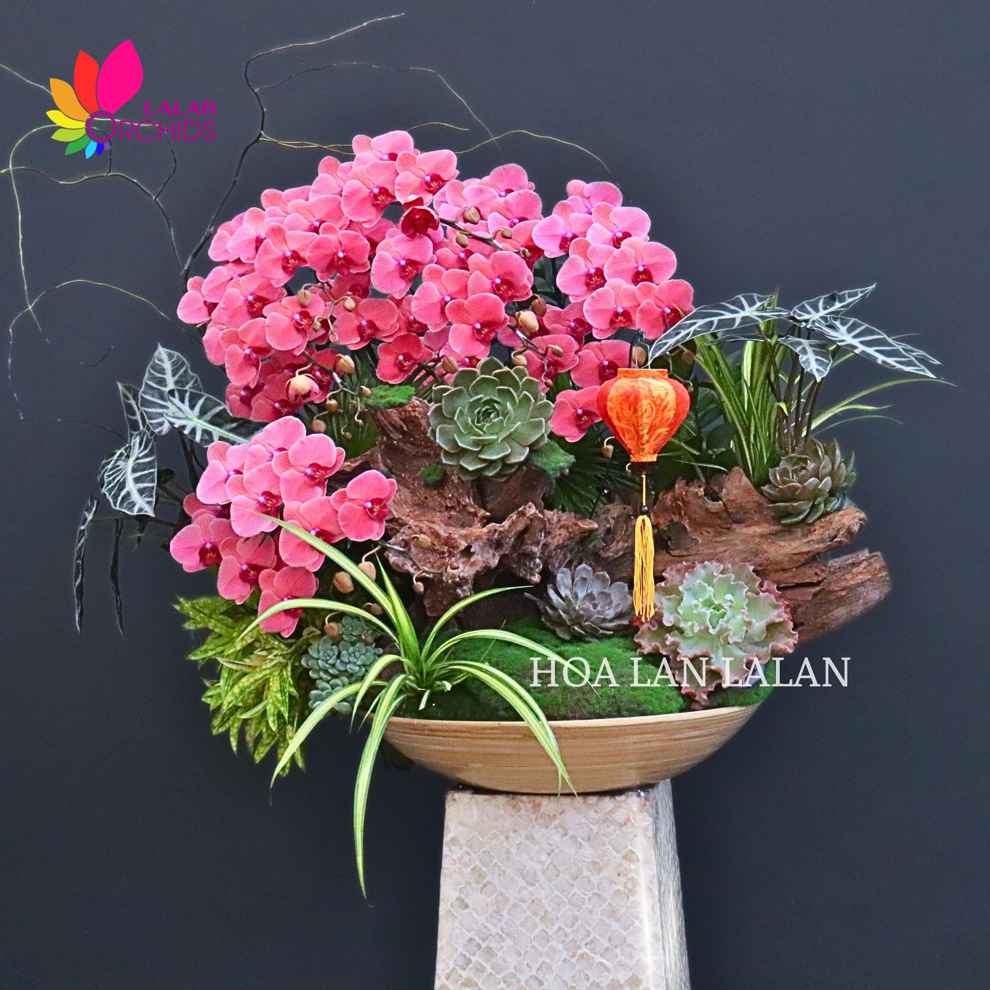 Tác phẩm Lan hồ điệp nổi bật với sắc cam đỏ sang trọng, được ghép khéo léo trên gỗ lũa tự nhiên, kết hợp cùng tiểu cảnh xanh và phụ kiện trang trí tinh tế. Tổng thể chậu hoa mang vẻ đẹp nghệ thuật, mềm mại nhưng vẫn rất nổi bật, tạo điểm nhấn ấn tượng cho không gian trưng bày.