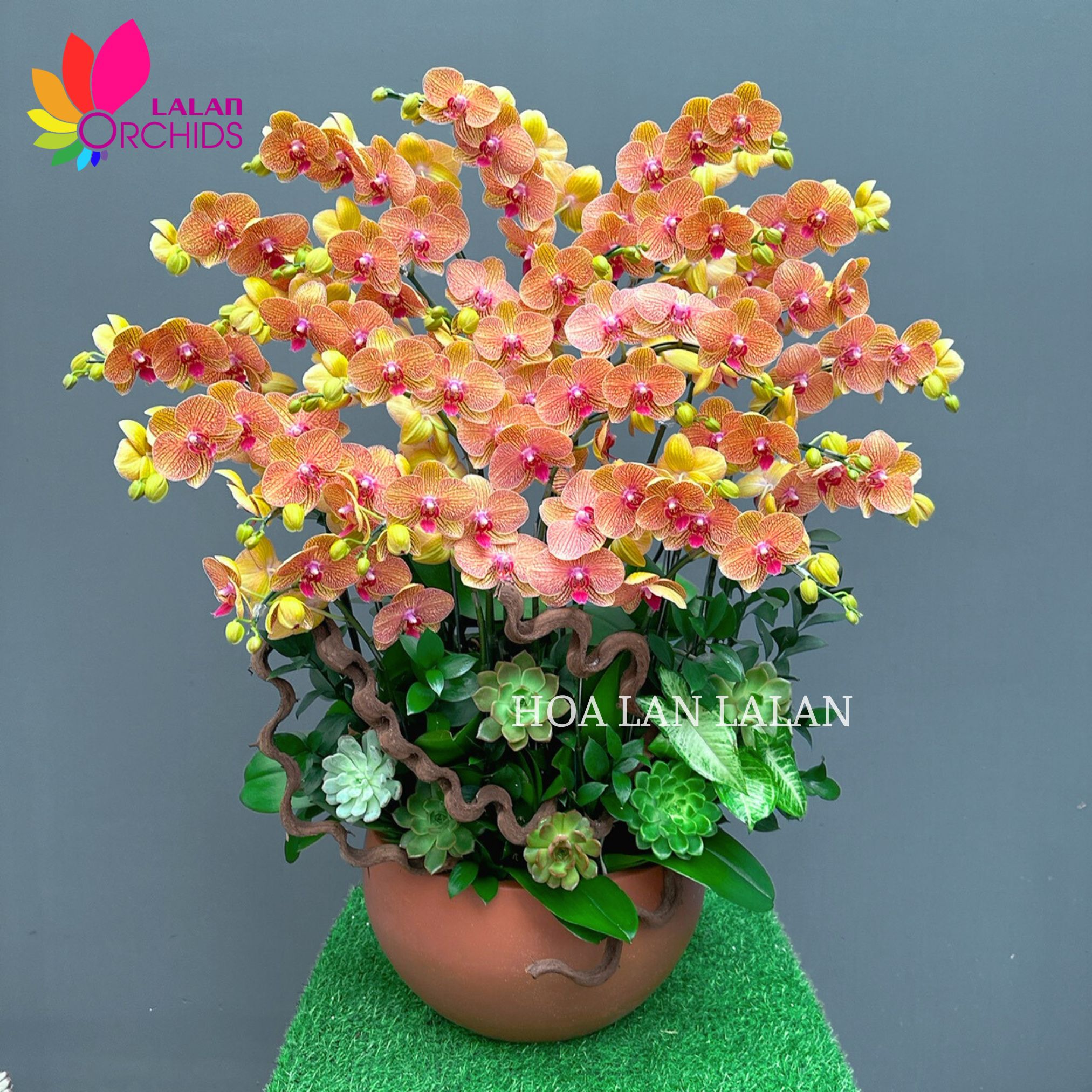 Lan hồ điệp cam sọc sen đá là một trong những mẫu chậu lan hồ điệp nổi bật và cuốn hút bởi sắc cam rực rỡ của lan hồ điệp và vẻ đẹp thanh tao của sen đá. Sự kết hợp này không chỉ đem lại sự tươi mới cho không gian mà còn mang ý nghĩa phong thủy sâu sắc, thu hút năng lượng tích cực.