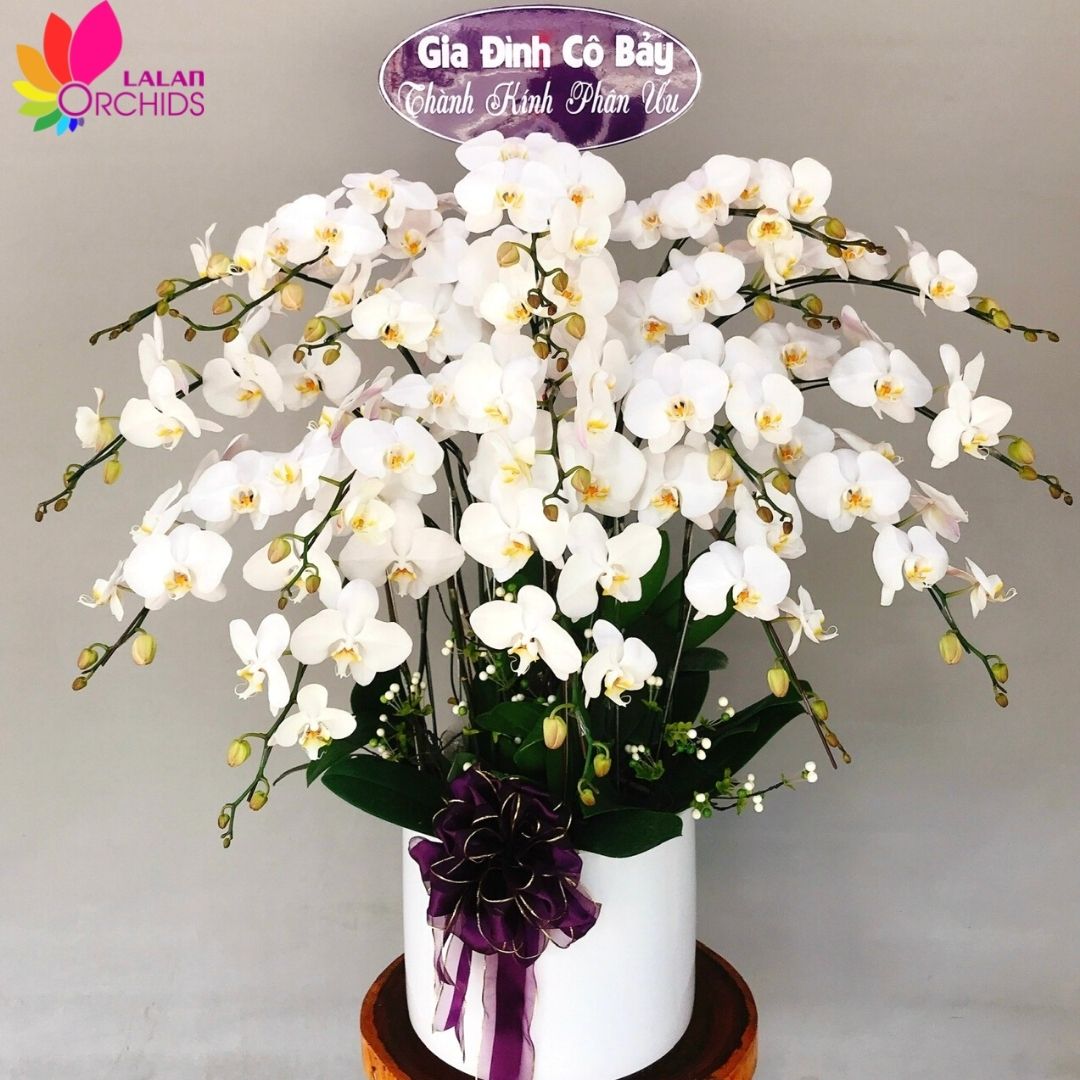 Lan hồ điệp chia buồn màu trắng 18 cành được kết hợp từ 18 cành lan cùng với chậu sứ và nơ trang trí, được những người thợ có tay nghề cao của Hoa lan Lalan thiết kế một cách tỉ mỉ.