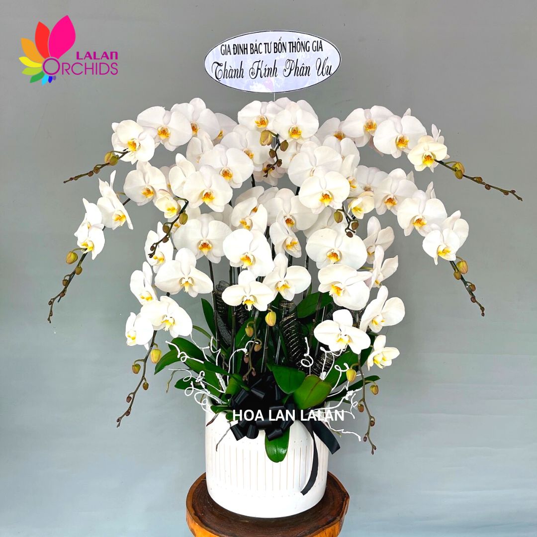 Lan hồ điệp chia buồn màu trắng 10 cành được kết hợp từ 10 cành lan cùng với chậu sứ và nơ trang trí, được những người thợ có tay nghề cao của Hoa lan Lalan thiết kế một cách tỉ mỉ.