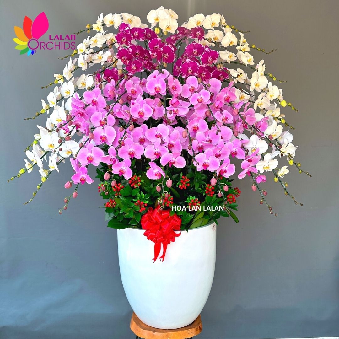 Chậu hoa lan hồ điệp đa sắc 40 cành kết hợp tinh tế của màu trắng, tím và hồng là một tác phẩm đẹp tuyệt vời của Hoa Lan Lalan.