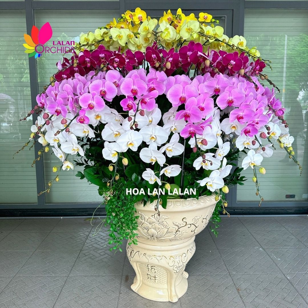 Hoa lan hồ điệp đa sắc được kết hợp bởi bốn sắc hoa lan hồ điệp trắng, tím, hồng, xanh táo được các nghệ nhân của Hoa lan Lalan cắm xen kẽ một cách hài hòa mang lại một vẻ đẹp khó tả.
