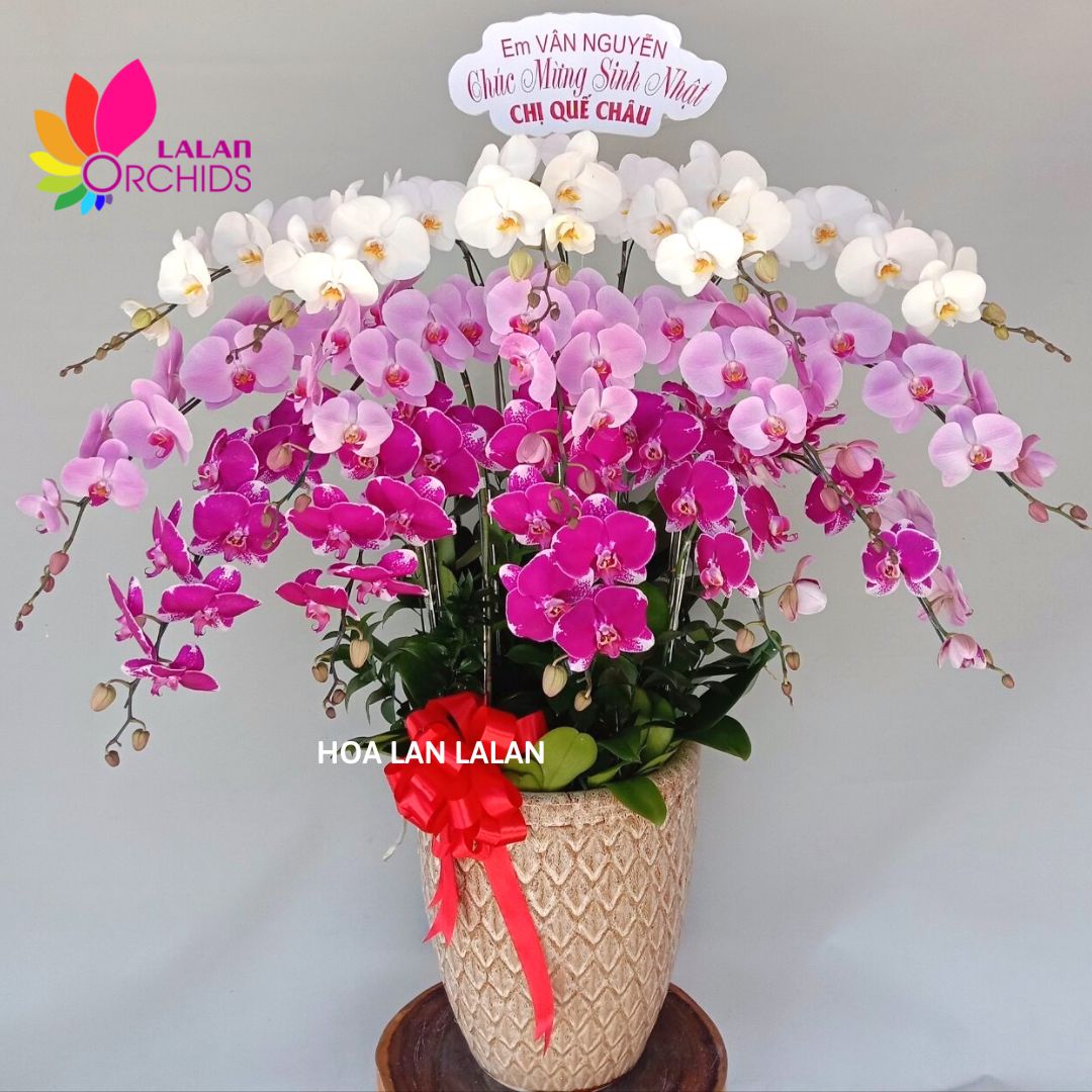 Chậu hoa lan hồ điệp đa sắc màu 15 cành ghép từ những cành lan hồ điệp chất lượng loại A với đặc điểm bông to, cành dài, siêu bền, được các nghệ nhân của Hoa lan Lalan ghép xen kẽ một cách hài hòa, nghệ thuật tạo nên chậu hoa lan đẹp sang trọng, quý phái và tinh tế.
