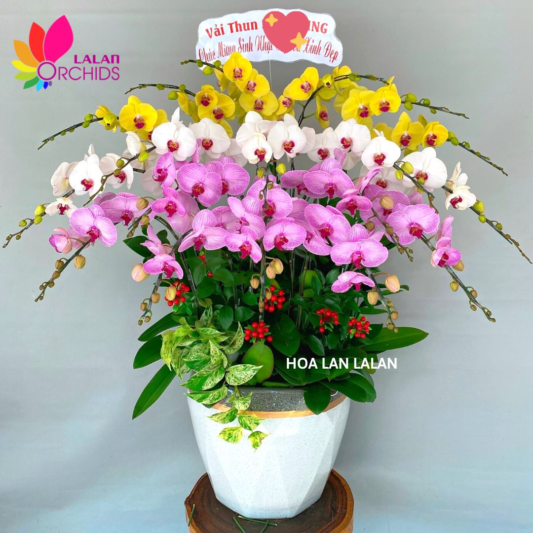 Lan hồ điệp đa sắc màu được ghép từ 18 cành lan hồ điệp chất lượng loại A với đặc điểm bông to, cành dài, siêu bền, đo các nghệ nhân của Hoa lan Lalan ghép xen kẽ một cách hài hòa, nghệ thuật tạo nên chậu hoa lan đẹp sang trọng, quý phái và tinh tế.