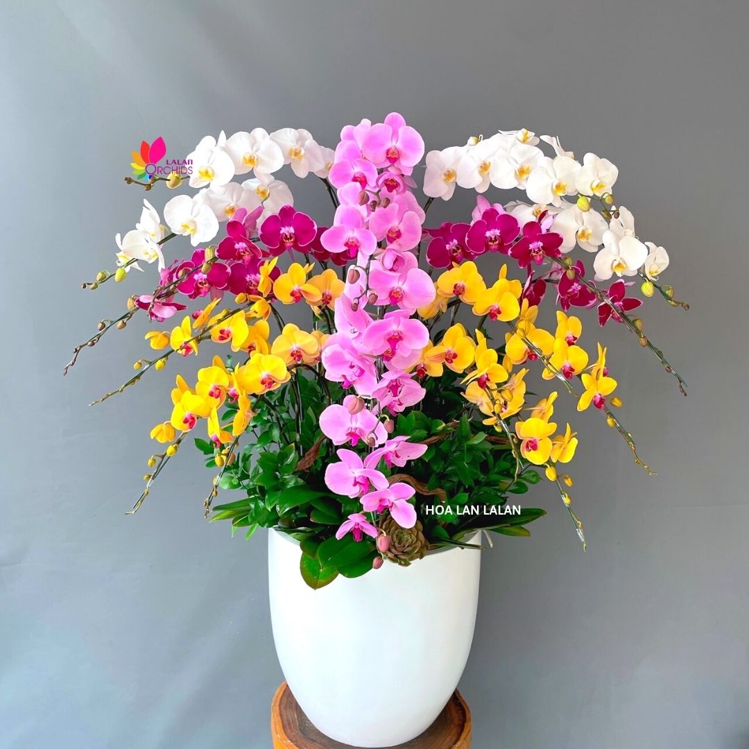 Lan hồ điệp 20 cành đa sắc màu, một tác phẩm nghệ thuật của thiên nhiên, tỏa sáng với vẻ đẹp tinh tế và sự đa dạng màu sắc. Sự phong phú màu sắc này không chỉ làm cho không gian trở nên lịch lãm và sang trọng mà còn mang theo những giá trị phong thủy đầy ý nghĩa.