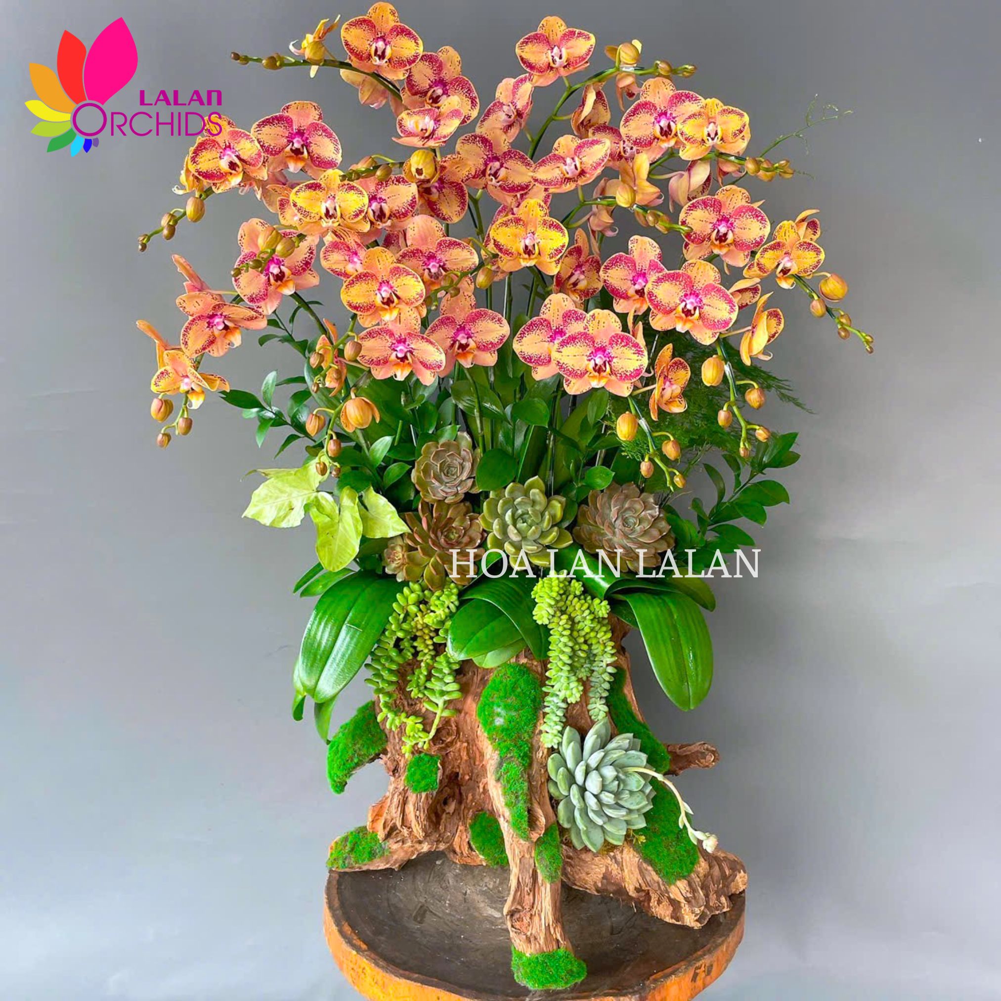 Tác phẩm lan hồ điệp đột biến cam ghép lũa là sự kết hợp hoàn mỹ giữa vẻ đẹp tự nhiên và nghệ thuật ghép lan hồ điệp. Những cánh lan hồ điệp màu cam đột biến hiếm gặp, rực rỡ như ánh bình minh, mang đến cảm giác tươi mới, tràn đầy sức sống. Bằng kinh nghiệm và sự khéo léo, thợ hoa Lalan mang đến tác phẩm lan hồ điệp vừa mộc mạc vừa sang trọng thể hiện sự giao thoa giữa thiên nhiên và bàn tay khéo léo của con người.