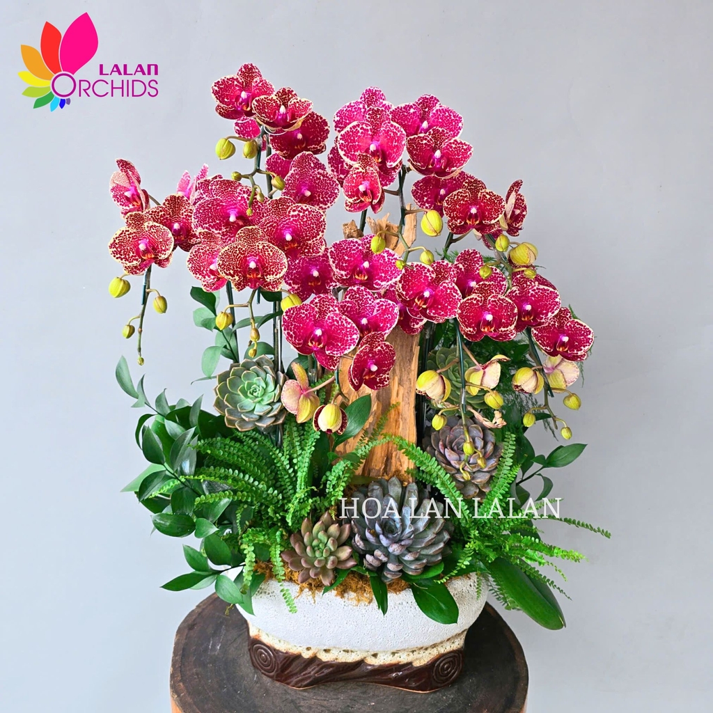 Chậu lan hồ điệp đột biến cam tiểu cảnh kết hợp giữa vẻ đẹp tinh tế sang trọng của lan hồ điệp và nghệ thuật trang trí bởi bàn tay con người. Mỗi sắc lan hồ điệp đột biến mang màu sắc rực rỡ, viền cánh mềm mại, họa tiết đột biến độc đáo không trùng lặp. Những chi tiết tiểu cảnh, sen đá, gỗ lũa kết hợp tạo nên tổng thể thanh lịch và sang trọng. Chậu lan hồ điệp là lựa chọn lý tưởng để trang trí không gian sống và làm việc.