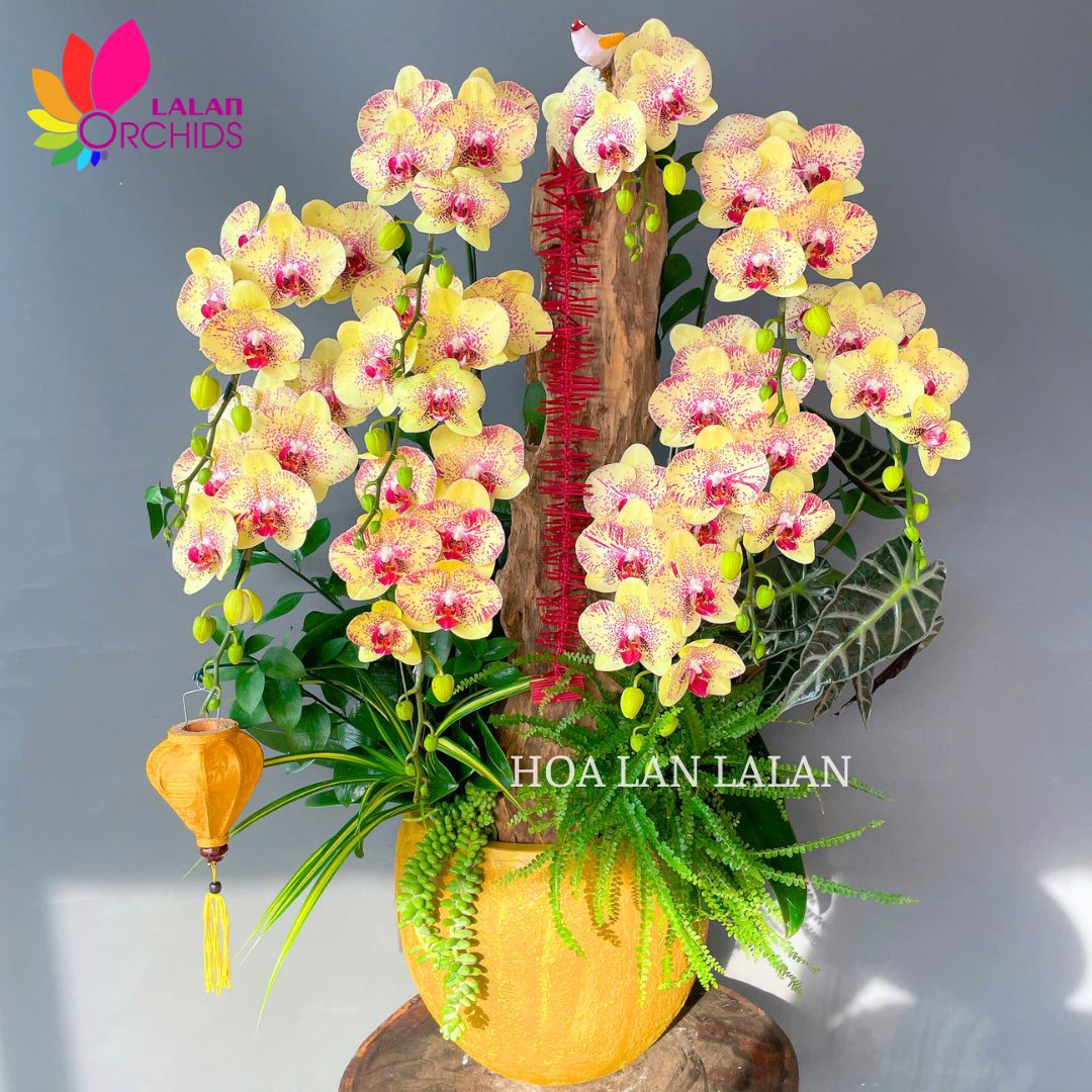 Chậu lan hồ điệp nổi bật với những cành lan hồ điệp loại 1, cánh hoa to dày, màu sắc rực rỡ và lâu tàn. Mỗi đóa lan hồ điệp mang trong mình vẻ đẹp độc đáo với sắc vàng ấm áp, điểm xuyết những chấm nhỏ tinh tế, tạo nên hiệu ứng thị giác bắt mắt và sang trọng. Chậu lan hồ điệp đột biến vàng chấm ghép lũa là điểm nhấn lý tưởng cho mọi không gian. Dù được đặt tại phòng khách, bàn làm việc, hay không gian tiếp khách của văn phòng, chậu lan hồ điệp ôm lũa đều mang lại sự trang nhã, sang trọng cho không gian và hài hòa về phong thủy.