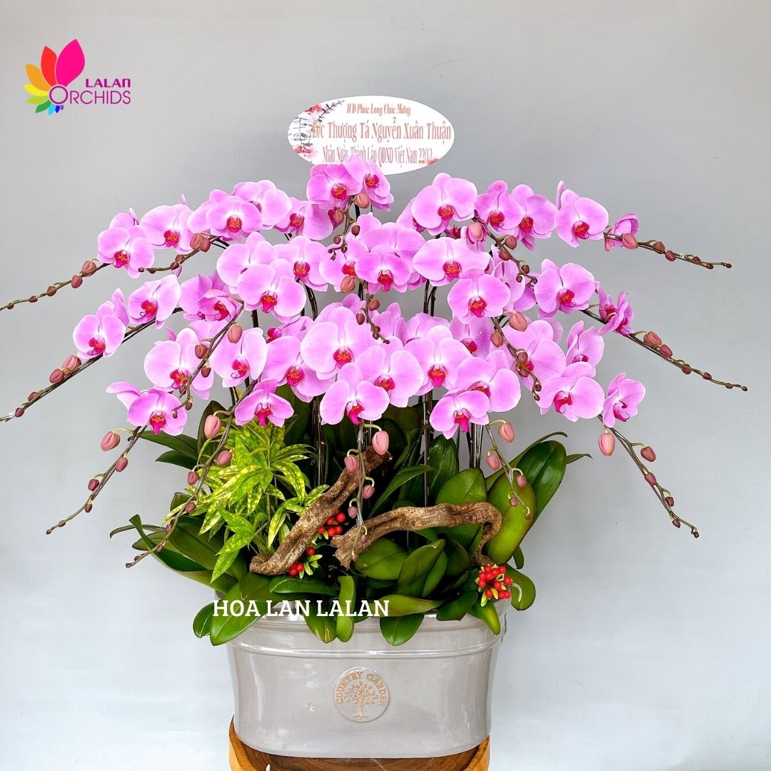 Lan hồ điệp hồng 15 cành lộng lẫy ghép từ những cành hoa lan chất lượng loại A với đặc điểm bông to, cành dài, siêu bền, được các nghệ nhân của Hoa lan Lalan ghép xen kẽ một cách hài hòa, nghệ thuật tạo nên chậu hoa lan đẹp sang trọng, quý phái và tinh tế.