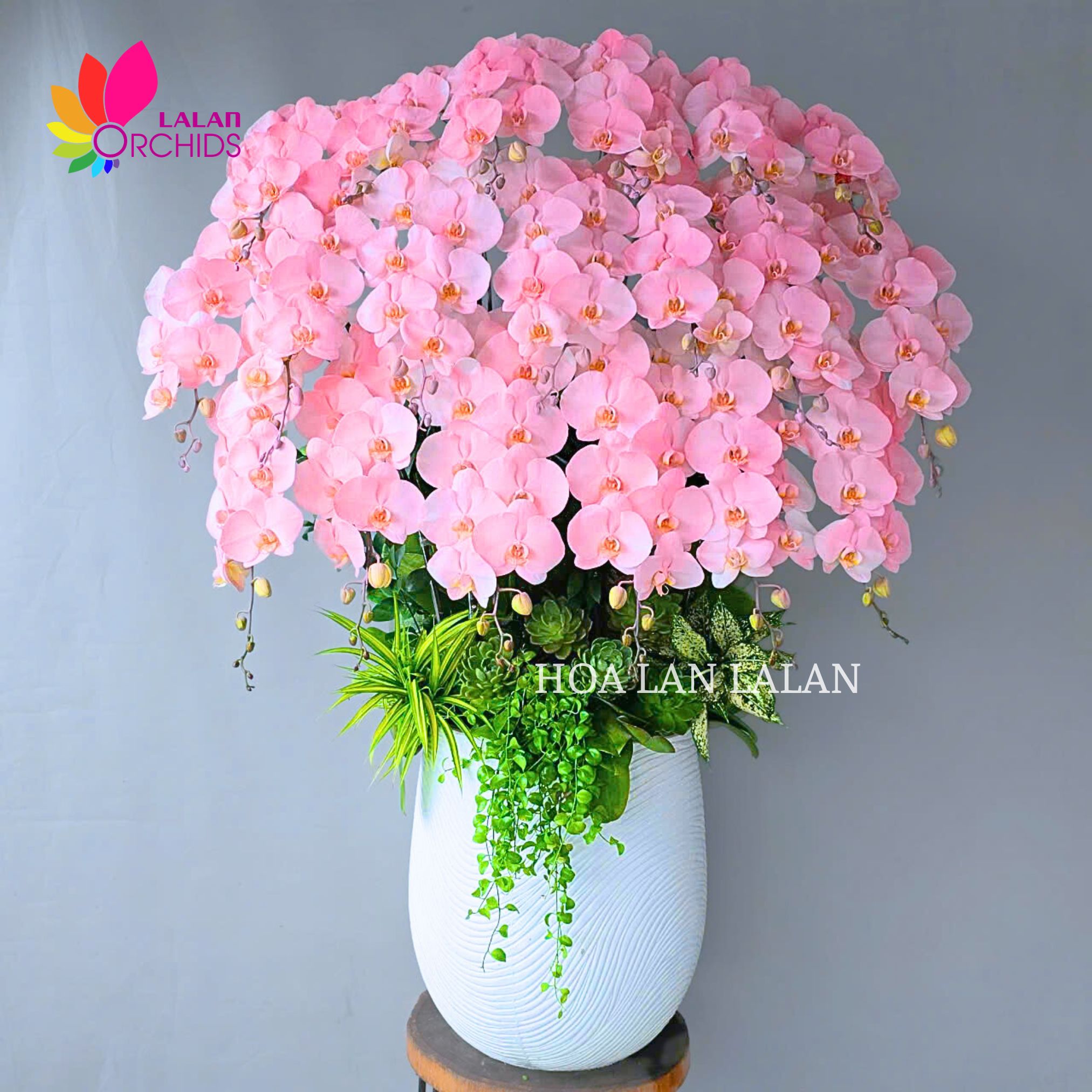 Lan hồ điệp hồng nổi bật với sắc hoa nhẹ nhàng, tinh khiết, được sắp xếp dày và đều, tạo thành một khối hoa lớn mềm mại, mang lại cảm giác tròn đầy và hài hòa. Những cánh hoa lan hồ điệp hồng phấn bung nở đồng loạt, xếp tầng khéo léo, giúp tổng thể chậu lan trở nên sang trọng nhưng vẫn giữ được nét dịu dàng, thanh lịch.