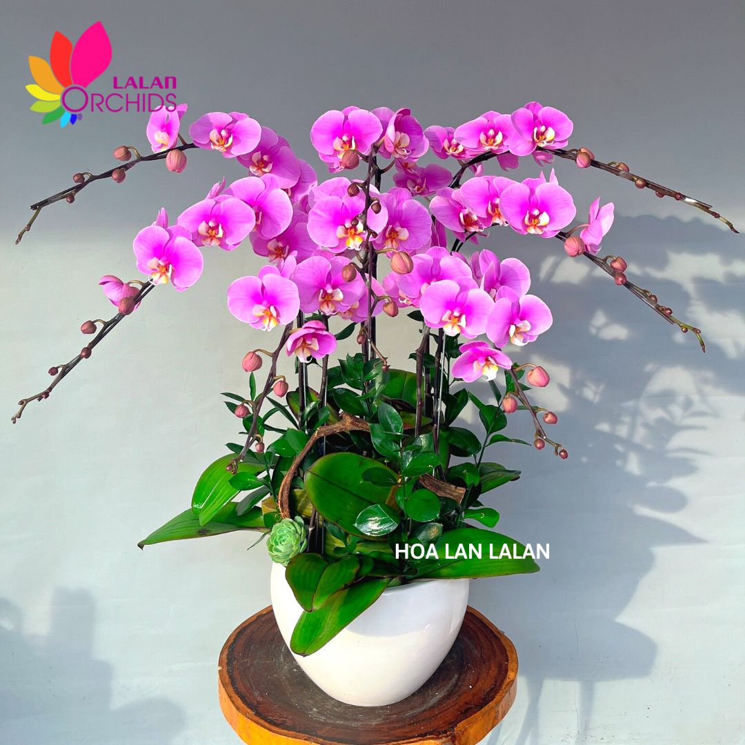 Lan hồ điệp hồng có vẻ đẹp sang trọng và nhẹ nhàng, là màu hoa tượng trưng cho tình yêu thương và sự may mắn. Chậu lan được ghép từ những cành hoa lan hồ điệp chất lượng loại A với đặc điểm bông to, cành dài, siêu bền, được các nghệ nhân của Hoa lan Lalan ghép xen kẽ một cách hài hòa, nghệ thuật tạo nên chậu hoa lan đẹp sang trọng, quý phái và tinh tế.