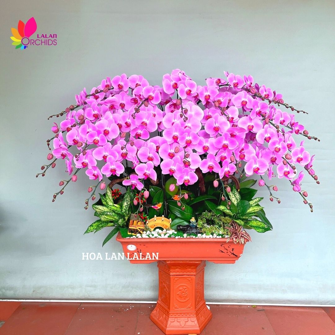 Lan hồ điệp hồng bonsai được ghép từ 25 cành lan màu hồng do các nghệ nhân của Hoa lan Lalan ghép theo nghệ thuật bonsai với các cành hoa xen kẽ một cách hài hòa, nghệ thuật tạo nên chậu hoa lan đẹp sang trọng, quý phái và tinh tế.