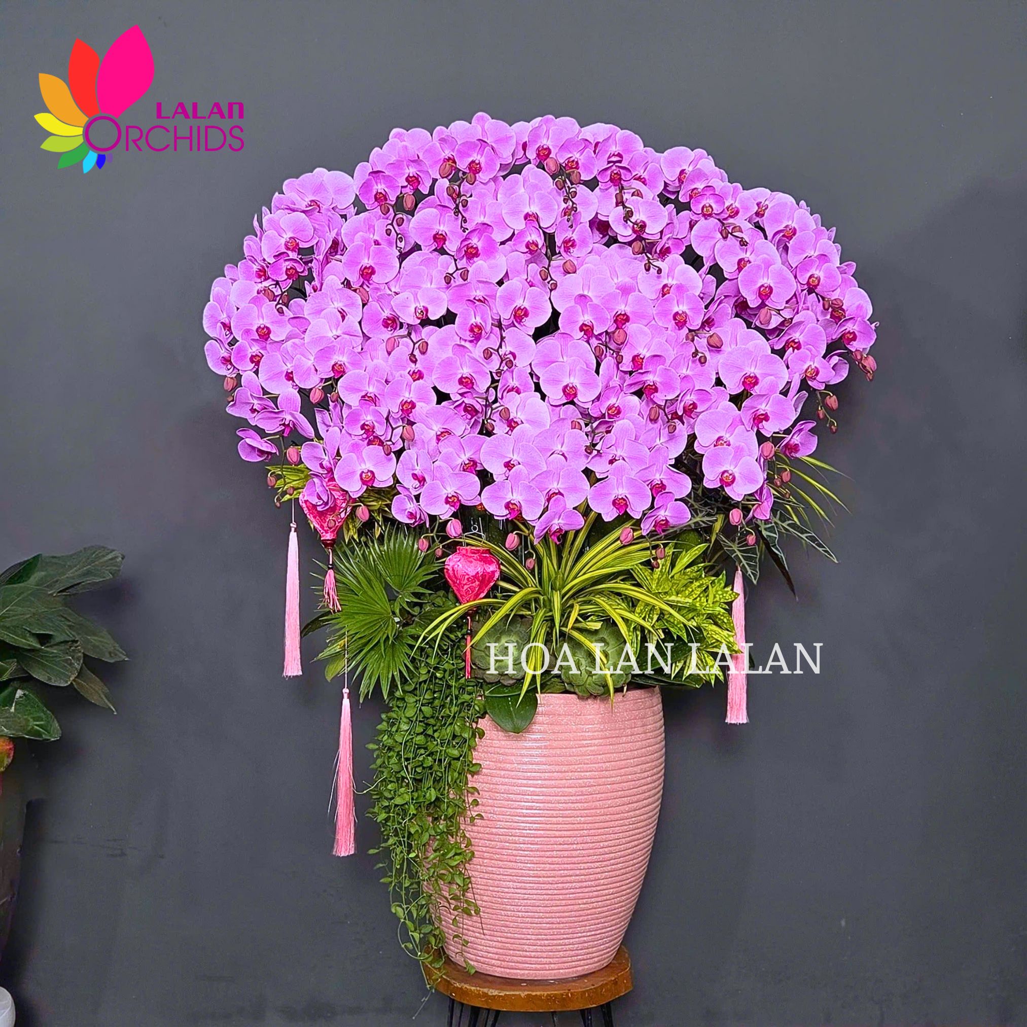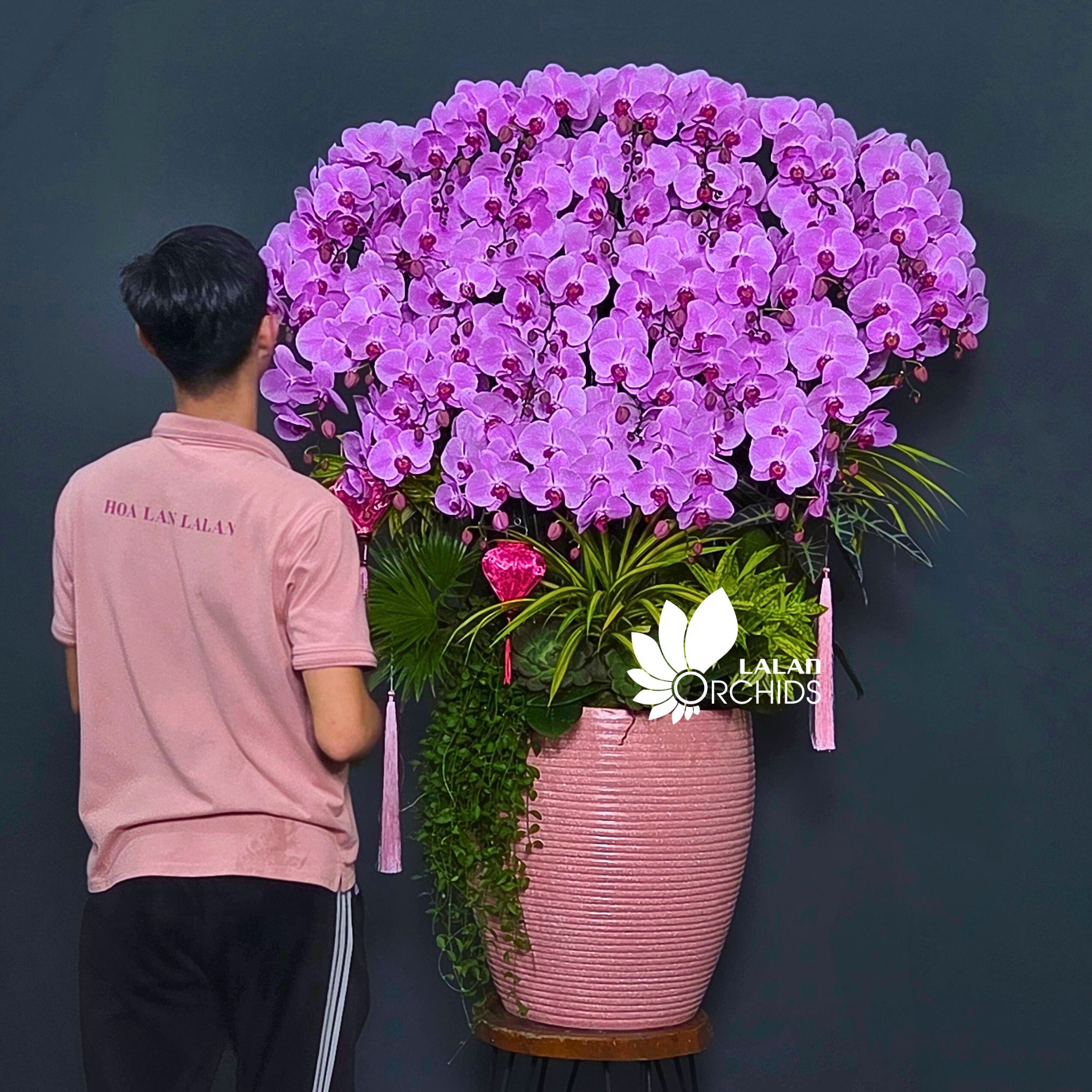 Thiết kế chậu được thợ hoa Hoa Lan Lalan chăm chút tỉ mỉ, bố cục 32 cành vươn cao hài hòa, tạo cảm giác sung túc, thịnh vượng và đầy khí thế. Sự kết hợp giữa dáng lan mềm mại và form chậu sang trọng giúp tác phẩm trở thành điểm nhấn nổi bật trong mọi không gian, xứng tầm trưng bày tại sảnh lớn, phòng khách cao cấp, văn phòng điều hành, showroom, khách sạn hay khu vực lễ tân doanh nghiệp.