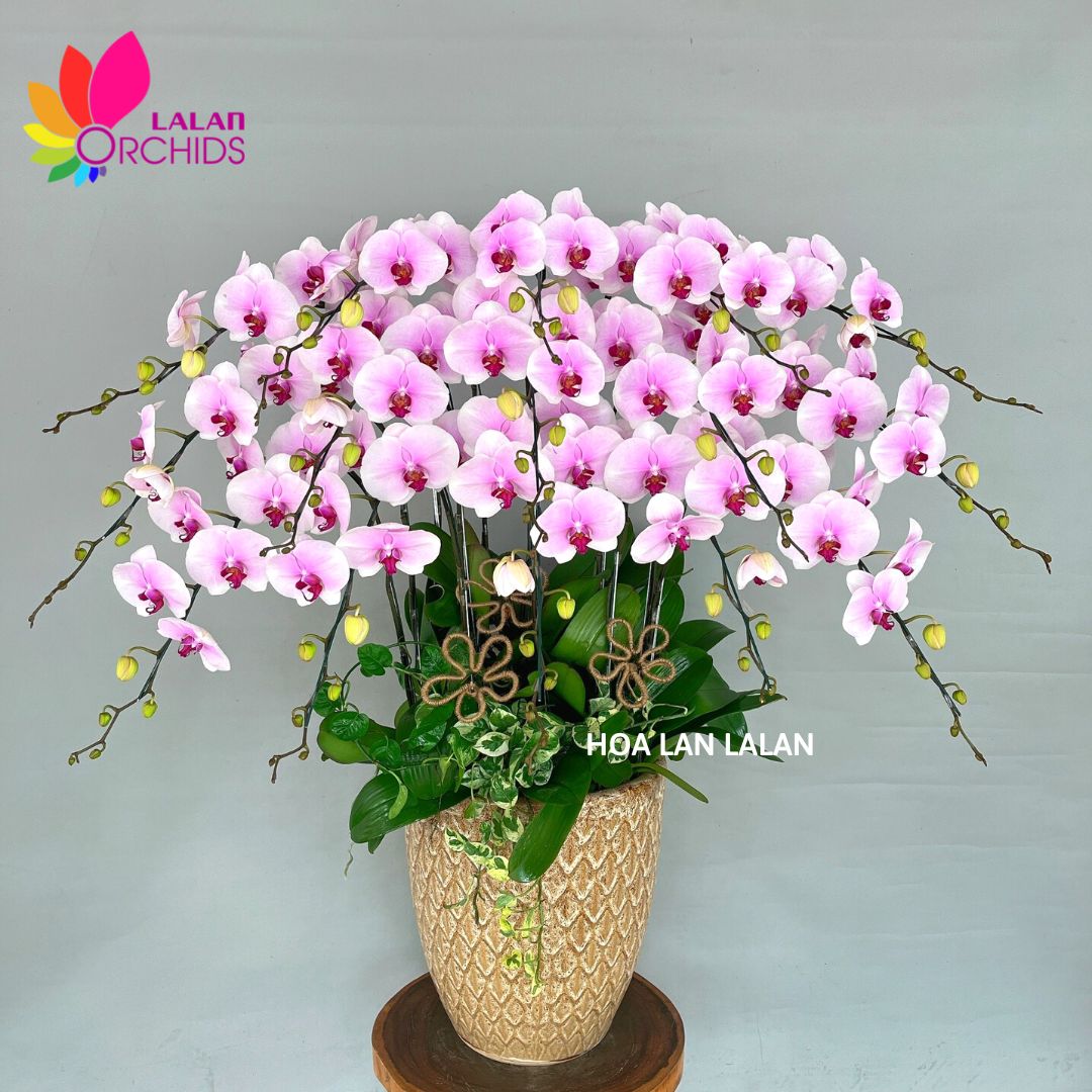 Chậu lan hồ điệp hồng phấn ghép từ 15 cành hoa lan hồ điệp chất lượng loại A với đặc điểm bông to, cành dài, siêu bền, được các nghệ nhân của Hoa lan Lalan ghép xen kẽ một cách hài hòa, nghệ thuật tạo nên chậu hoa lan đẹp sang trọng, quý phái và tinh tế.