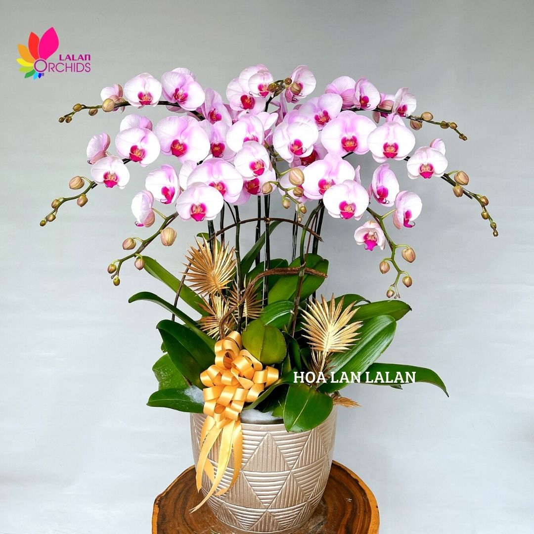 Lan hồ điệp hồng phấn 8 cành đẹp ngọt ngào ghép từ những cành hoa lan chất lượng loại A với đặc điểm bông to, cành dài, siêu bền, được các nghệ nhân của Hoa lan Lalan ghép xen kẽ một cách hài hòa, nghệ thuật tạo nên chậu hoa lan đẹp sang trọng, quý phái và tinh tế.