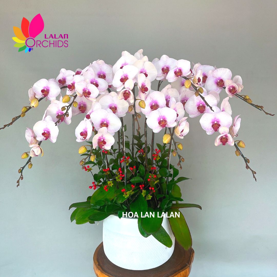 Chậu lan hồ điệp hồng được các nghệ nhân của Hoa lan Lalan ghép xen kẽ một cách hài hòa, nghệ thuật tạo nên chậu hoa lan đẹp sang trọng, quý phái và tinh tế.