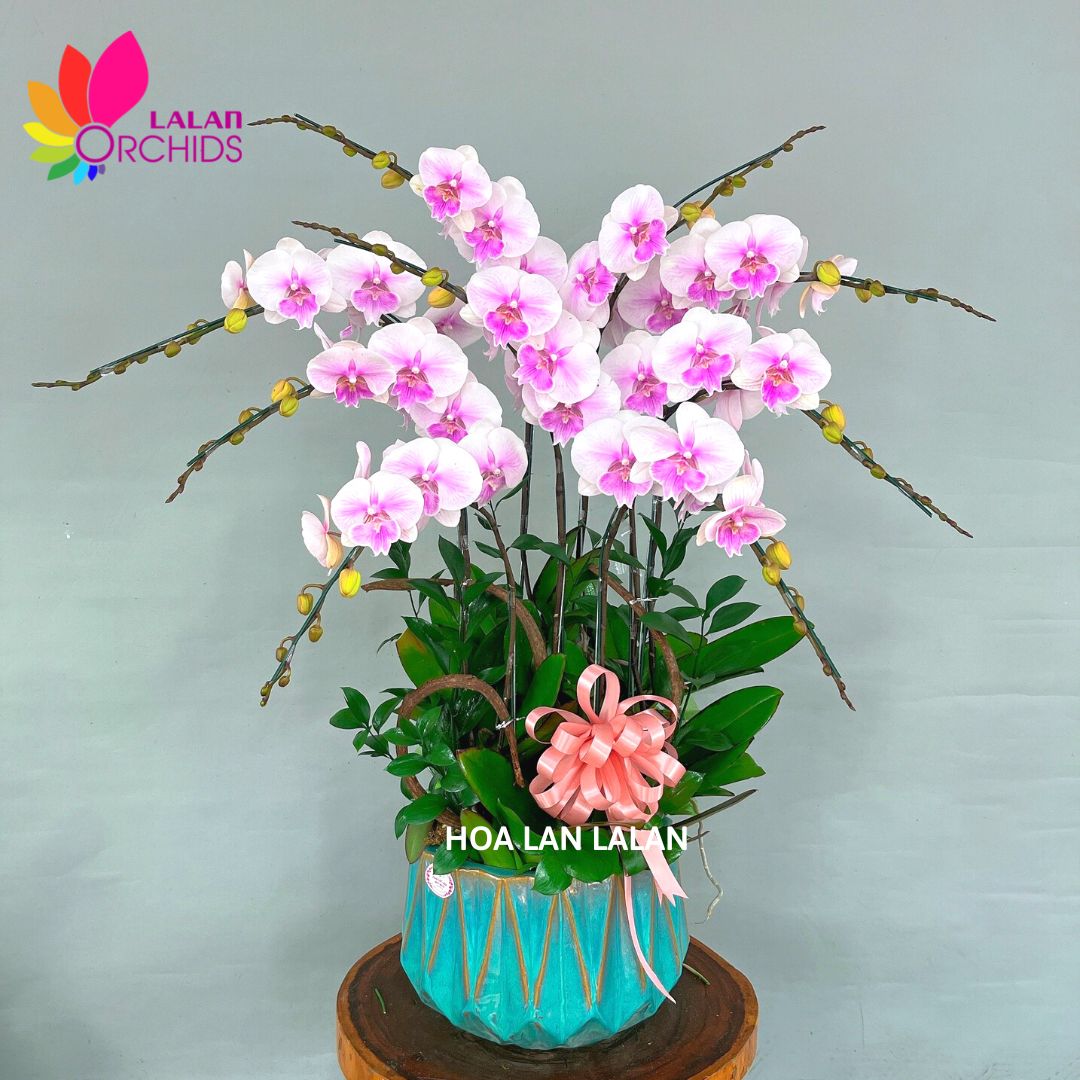 Lan hồ điệp màu hồng phấn ghép từ chín cành lan hồ điệp chất lượng loại A với đặc điểm bông to, cành dài, siêu bền, được các nghệ nhân của Hoa lan Lalan ghép xen kẽ một cách hài hòa, nghệ thuật tạo nên chậu hoa lan đẹp sang trọng, quý phái và tinh tế.