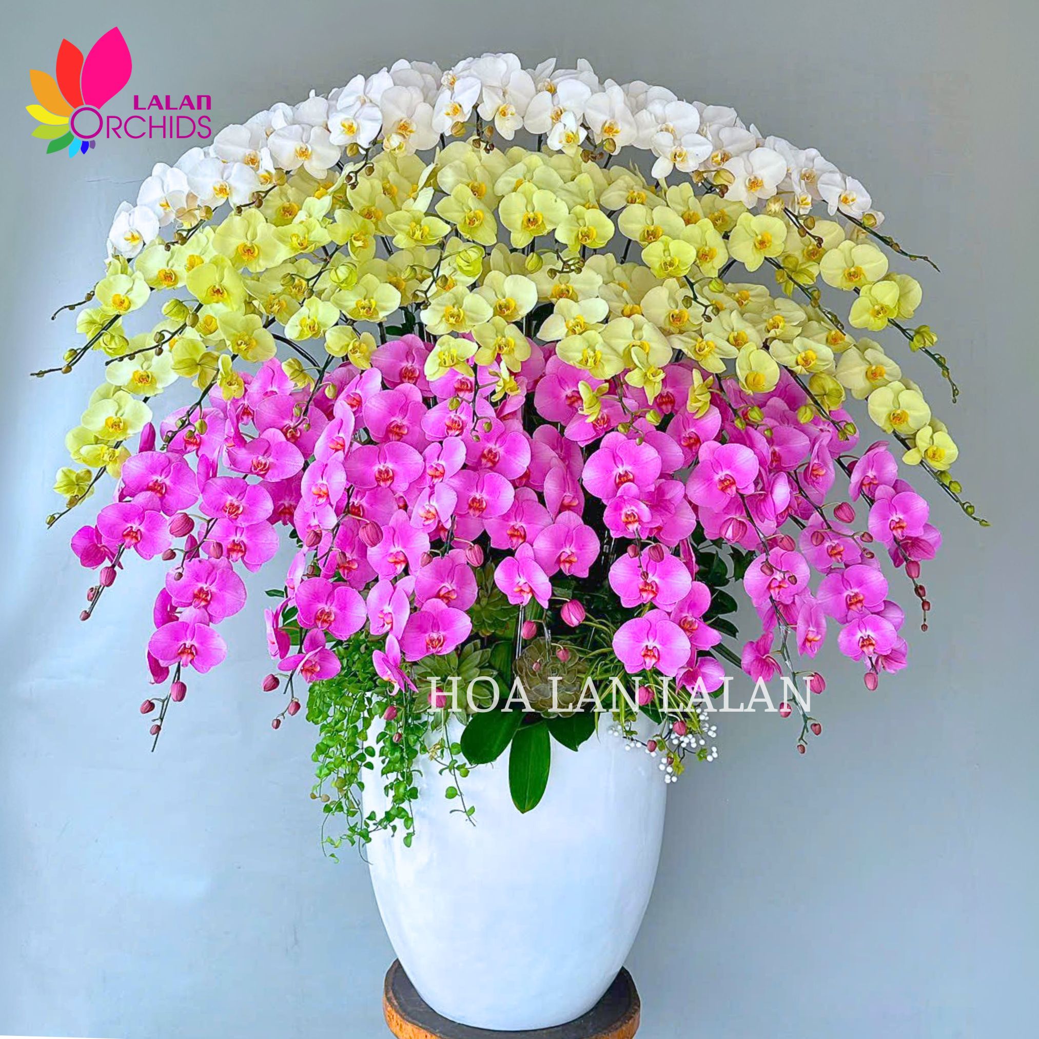 Chậu lan hồ điệp khai trương gây ấn tượng mạnh với bố cục mái vòm lớn, được ghép từ 40 cành lan nở đều và rực rỡ. Sự phối hợp hài hòa giữa ba gam trắng – xanh bơ – hồng không chỉ tạo hiệu ứng thị giác nổi bật mà còn mang ý nghĩa khởi đầu may mắn, tài lộc dồi dào và phát triển bền vững.