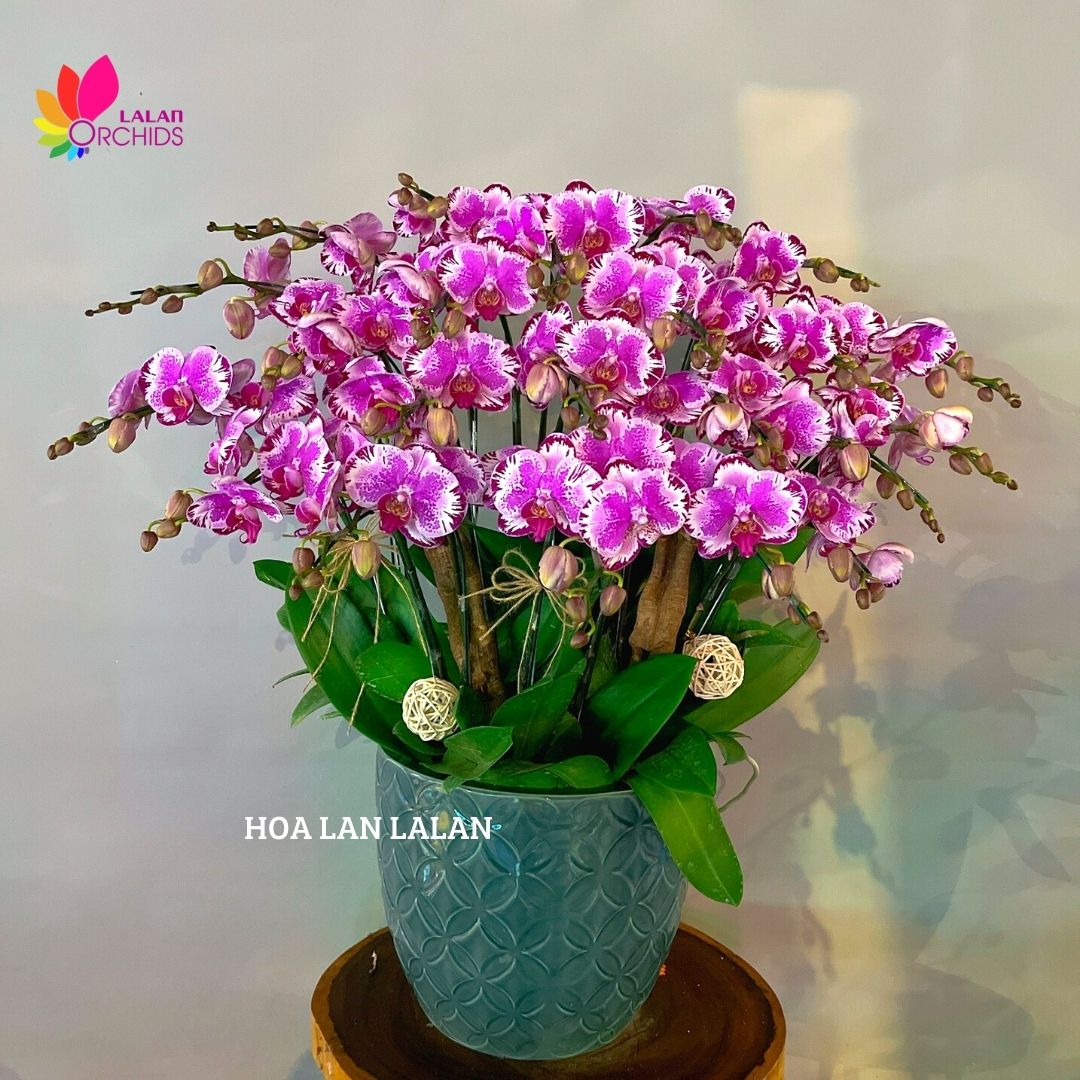 Lan hồ điệp màu chớp 2 vòi ghép từ những cành hoa lan hồ điệp chất lượng loại A với đặc điểm bông to, cành dài, siêu bền, được các nghệ nhân của Hoa lan Lalan ghép xen kẽ một cách hài hòa, nghệ thuật tạo nên chậu hoa lan đẹp sang trọng, quý phái và tinh tế.