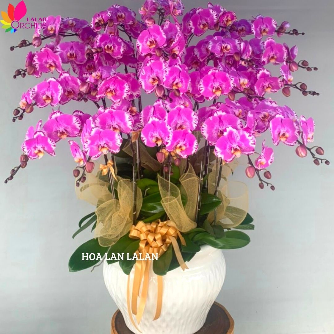 Lan hồ điệp màu hông đột biến 20 cành ghép từ những cành hoa lan chất lượng loại A với đặc điểm bông to, cành dài, siêu bền, được các nghệ nhân của Hoa lan Lalan ghép xen kẽ một cách hài hòa, nghệ thuật tạo nên chậu hoa lan đẹp sang trọng, quý phái và tinh tế.