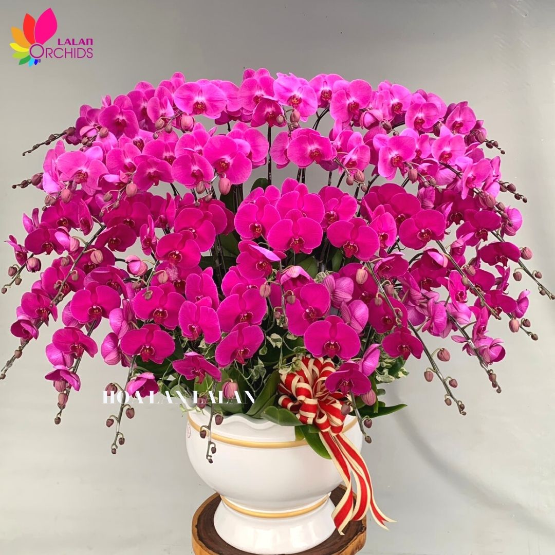 Chậu hoa lan hồ điệp màu hồng, tím 30 cành ghép từ những cành hoa lan chất lượng loại A với đặc điểm bông to, cành dài, siêu bền, được các nghệ nhân của Hoa lan Lalan ghép xen kẽ một cách hài hòa, nghệ thuật tạo nên chậu hoa lan đẹp sang trọng, quý phái và tinh tế.