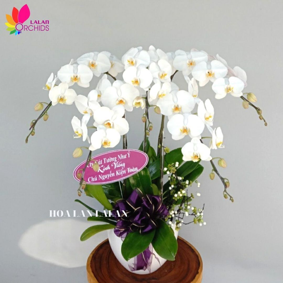 Chậu hoa lan hồ điệp màu trắng 5 cành ghép từ những cành hoa lan chất lượng loại A với đặc điểm bông to, cành dài, siêu bền, được các nghệ nhân của Hoa lan Lalan ghép xen kẽ một cách hài hòa, nghệ thuật tạo nên chậu hoa lan đẹp sang trọng.