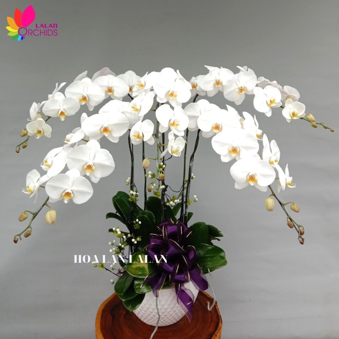 Chậu hoa lan hồ điệp màu trắng 5 cành tinh tế ghép từ những cành hoa lan chất lượng loại A với đặc điểm bông to, cành dài, siêu bền, được các nghệ nhân của Hoa lan Lalan ghép xen kẽ một cách hài hòa, nghệ thuật tạo nên chậu hoa lan đẹp sang trọng, quý phái và tinh tế.