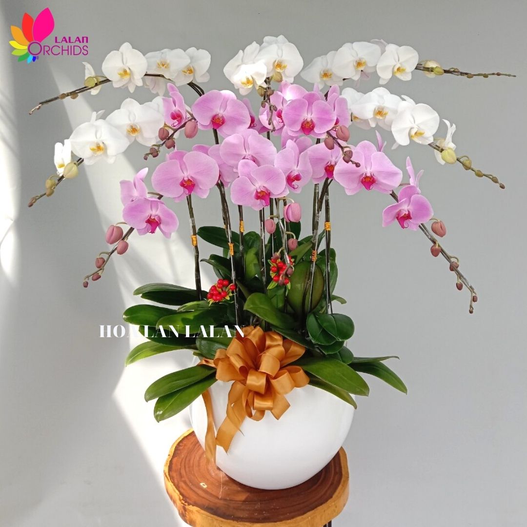 Chậu hoa lan hồ điệp màu trắng, hồng 10 cành ghép từ những cành hoa lan chất lượng loại A với đặc điểm bông to, cành dài, siêu bền, được các nghệ nhân của Hoa lan Lalan ghép xen kẽ một cách hài hòa, nghệ thuật tạo nên chậu hoa lan đẹp sang trọng, quý phái và tinh tế.