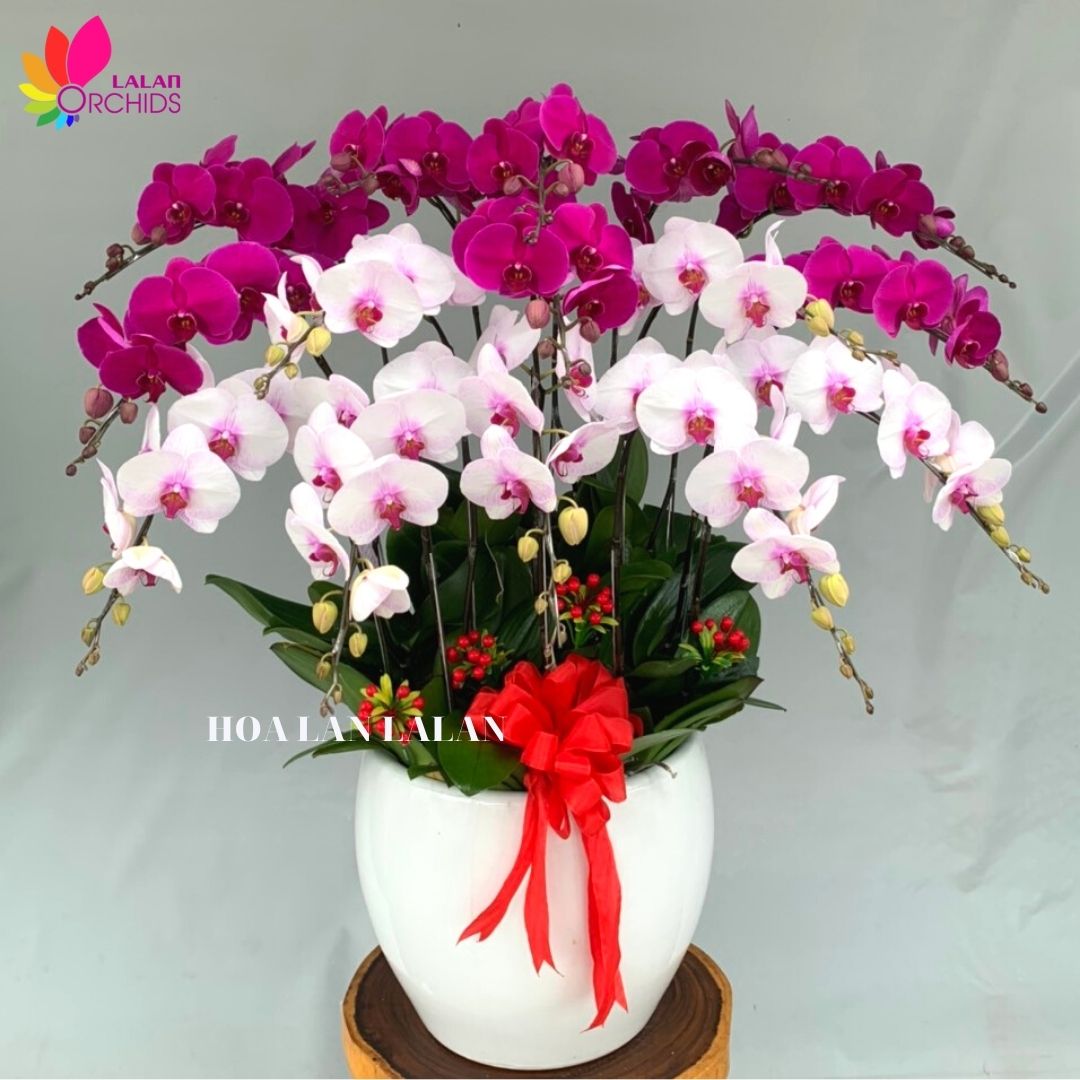 Chậu hoa lan hồ điệp màu trắng, tím 15 cành sang trọng ghép từ những cành hoa lan chất lượng loại A với đặc điểm bông to, cành dài, siêu bền, được các nghệ nhân của Hoa lan Lalan ghép xen kẽ một cách hài hòa, nghệ thuật tạo nên chậu hoa lan đẹp sang trọng, quý phái và tinh tế.