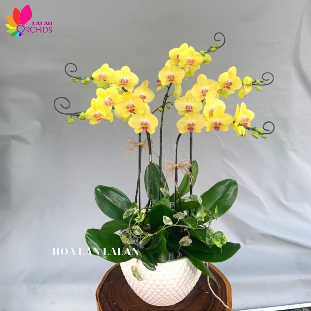 Chậu hoa lan hồ điệp màu vàng 5 cành đẹp tinh tế ghép từ những cành hoa lan chất lượng loại A với đặc điểm bông to, cành dài, siêu bền, được các nghệ nhân của Hoa lan Lalan ghép xen kẽ một cách hài hòa, nghệ thuật tạo nên chậu hoa lan đẹp sang trọng, quý phái và tinh tế.