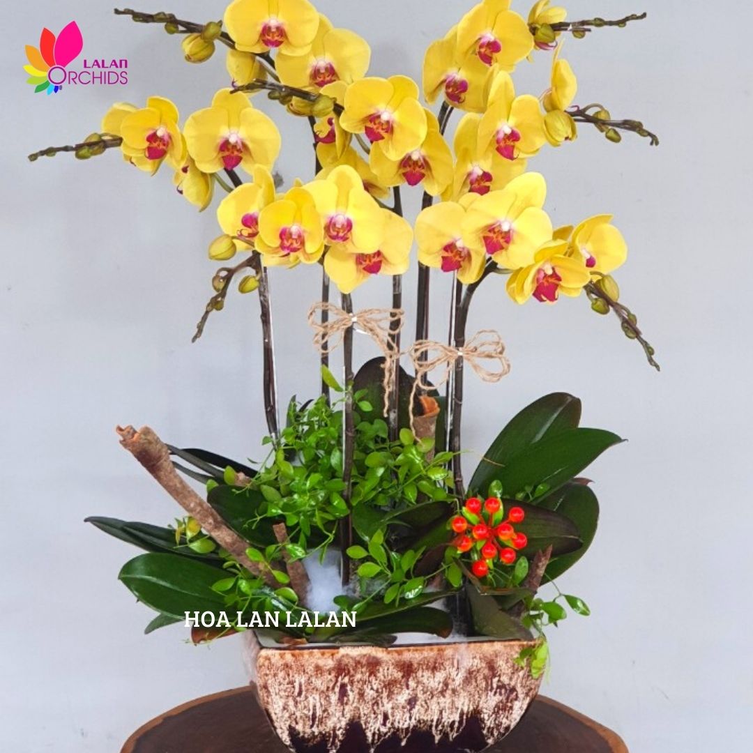 Lan hồ điệp màu vàng 7 cành ghép từ những cành hoa lan chất lượng loại A với đặc điểm bông to, cành dài, siêu bền, được các nghệ nhân của Hoa lan Lalan ghép xen kẽ một cách hài hòa, nghệ thuật tạo nên chậu hoa lan đẹp sang trọng, quý phái và tinh tế.