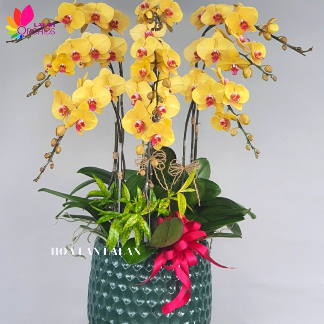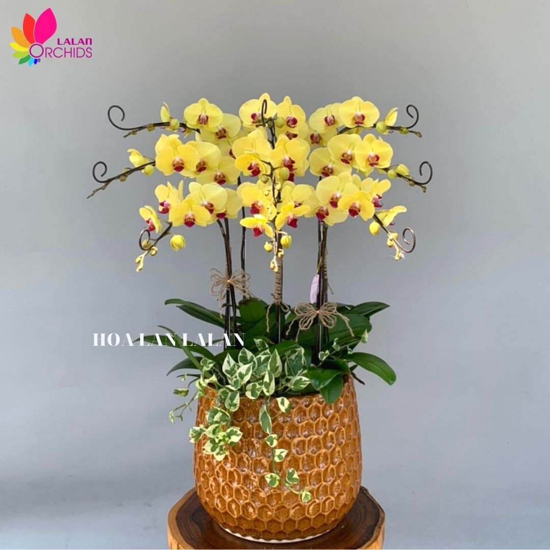 Chậu hoa lan hồ điệp màu vàng 9 cành rực rỡ ghép từ những cành hoa lan chất lượng loại A với đặc điểm bông to, cành dài, siêu bền, được các nghệ nhân của Hoa lan Lalan ghép xen kẽ một cách hài hòa, nghệ thuật tạo nên chậu hoa lan đẹp sang trọng, quý phái và tinh tế.