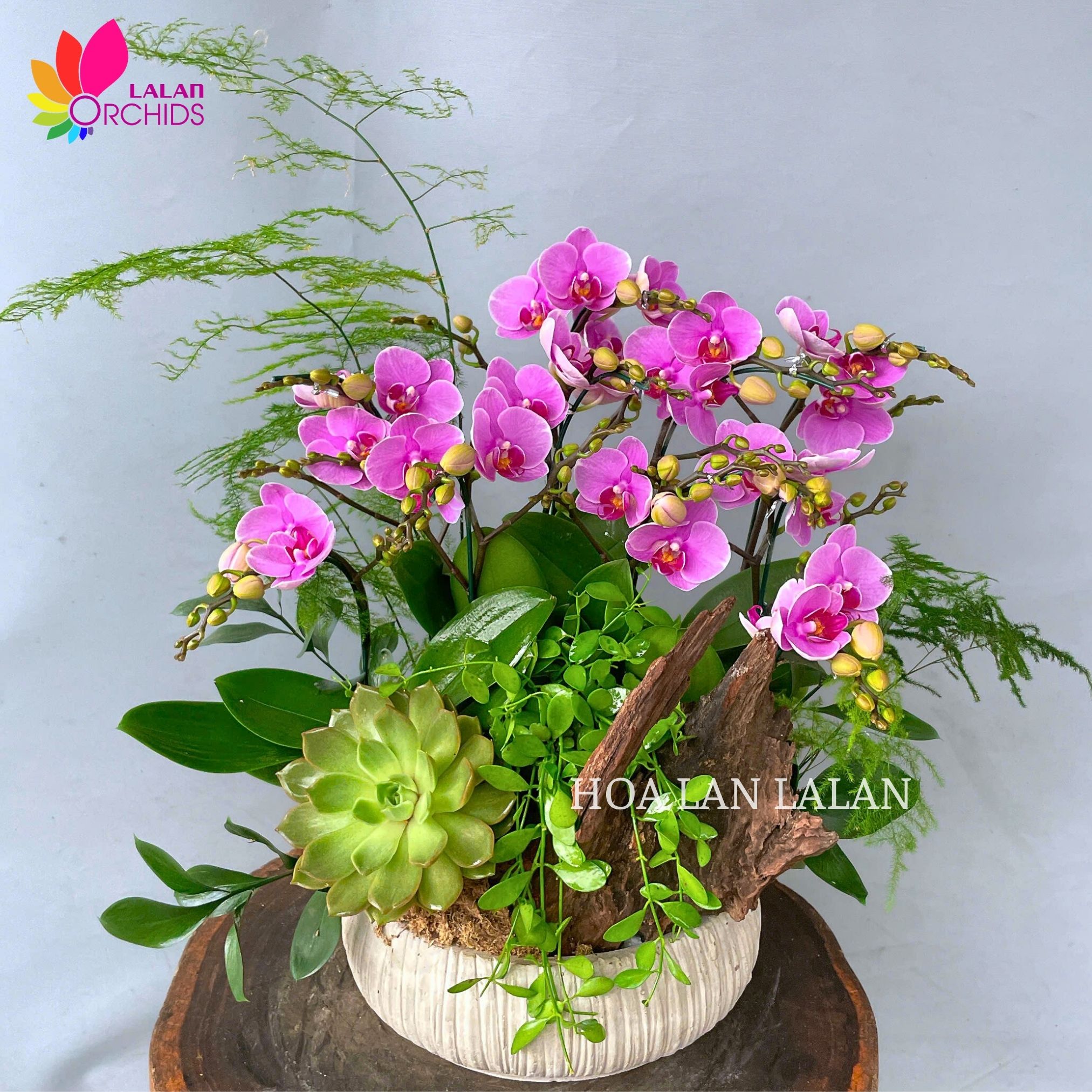 Chậu lan hồ điệp mini tiểu cảnh để bàn được thiết kế nhỏ gọn, phù hợp để trang trí trên bàn làm việc, bàn trà, kệ sách hoặc bất kì không gian nào đều phù hợp. Những bông lan hồ điệp mini nhỏ xinh, sắc hồng phấn ngọt ngào mang đến vẻ đẹp tinh tế và thanh lịch. Điểm nhấn của lan hồ điệp là sự kết hợp giữa lan hồ điệp, gỗ lũa, sen đá và cây xanh tạo tiểu cảnh mini xung quanh, mang đến sự hài hòa giữa hoa, gỗ, sen đá và cây cảnh xanh tươi, chậu lan hồ điệp sẽ giúp không gian của bạn trở nên sinh động, gần gũi thiên nhiên hơn.