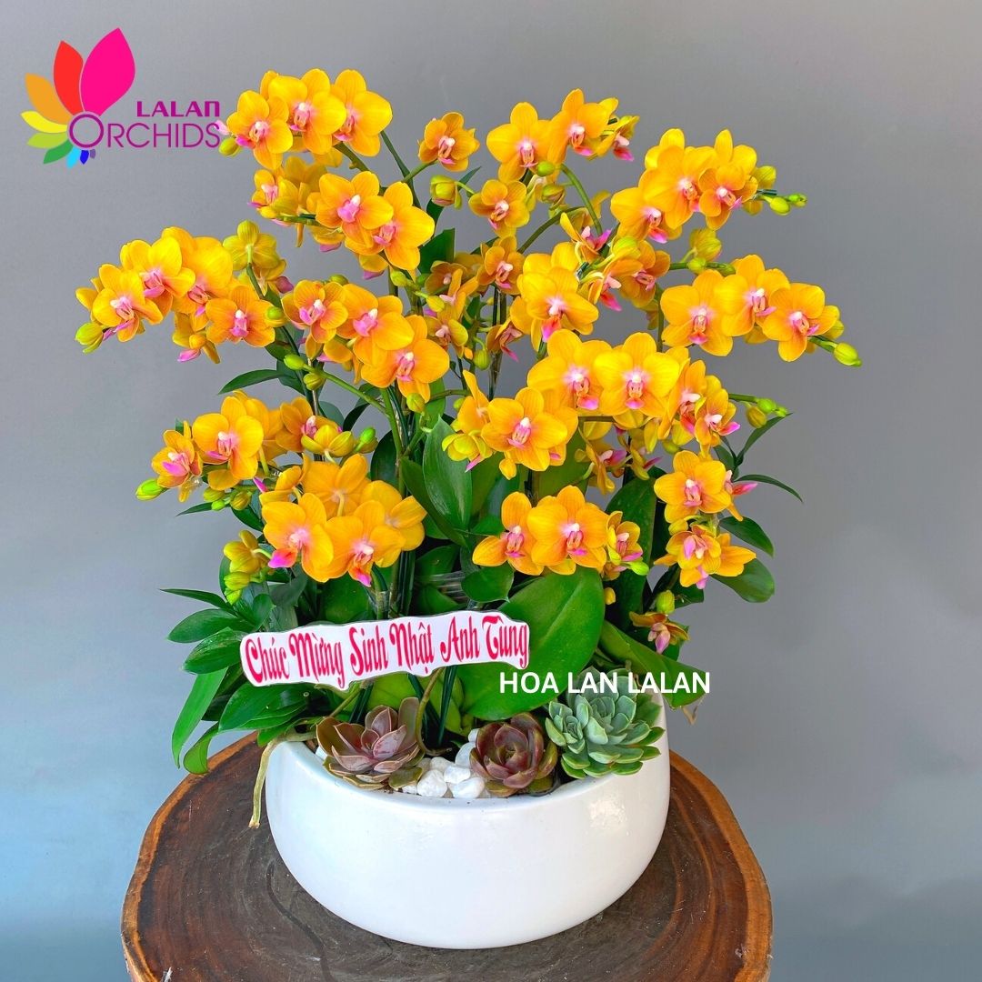 Lan hồ điệp mini vàng được phối hợp từ 8 cây lan mini kết hợp cùng cây sen đá và chậu tiểu cảnh, tạo nên chậu hoa lan đẹp sang trọng, đẳng cấp làm cuốn hút mọi ánh nhìn.