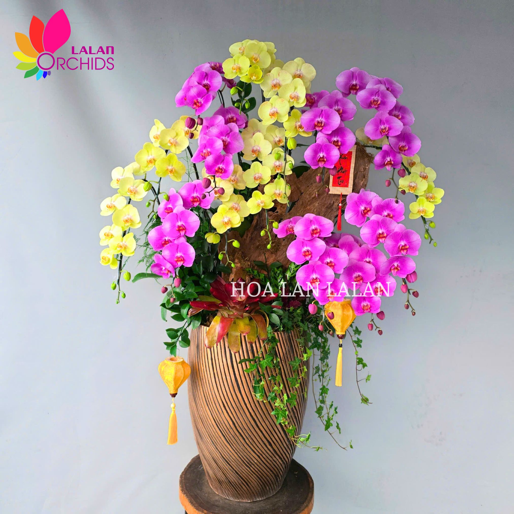 Chậu lan hồ điệp mix màu ghép nghệ thuật kết hợp tinh tế giữa nét đẹp cổ điển và phong cách hiện đại, tạo nên một tác phẩm nghệ thuật đậm chất thiên nhiên, sang trọng và quý phái. Chậu lan hồ điệp được lấy cảm hứng từ nghệ thuật trang trí cổ phong được thợ hoa Lalan tái hiện với sự sáng tạo hiện đại. Mỗi cánh lan hồ điệp như một nét chấm phá tuyệt đẹp rực rỡ và kiêu sa. Cùng với đó, chậu gốm sứ giúp tôn lên vẻ đẹp tông thể của chậu hoa lan hồ điệp.