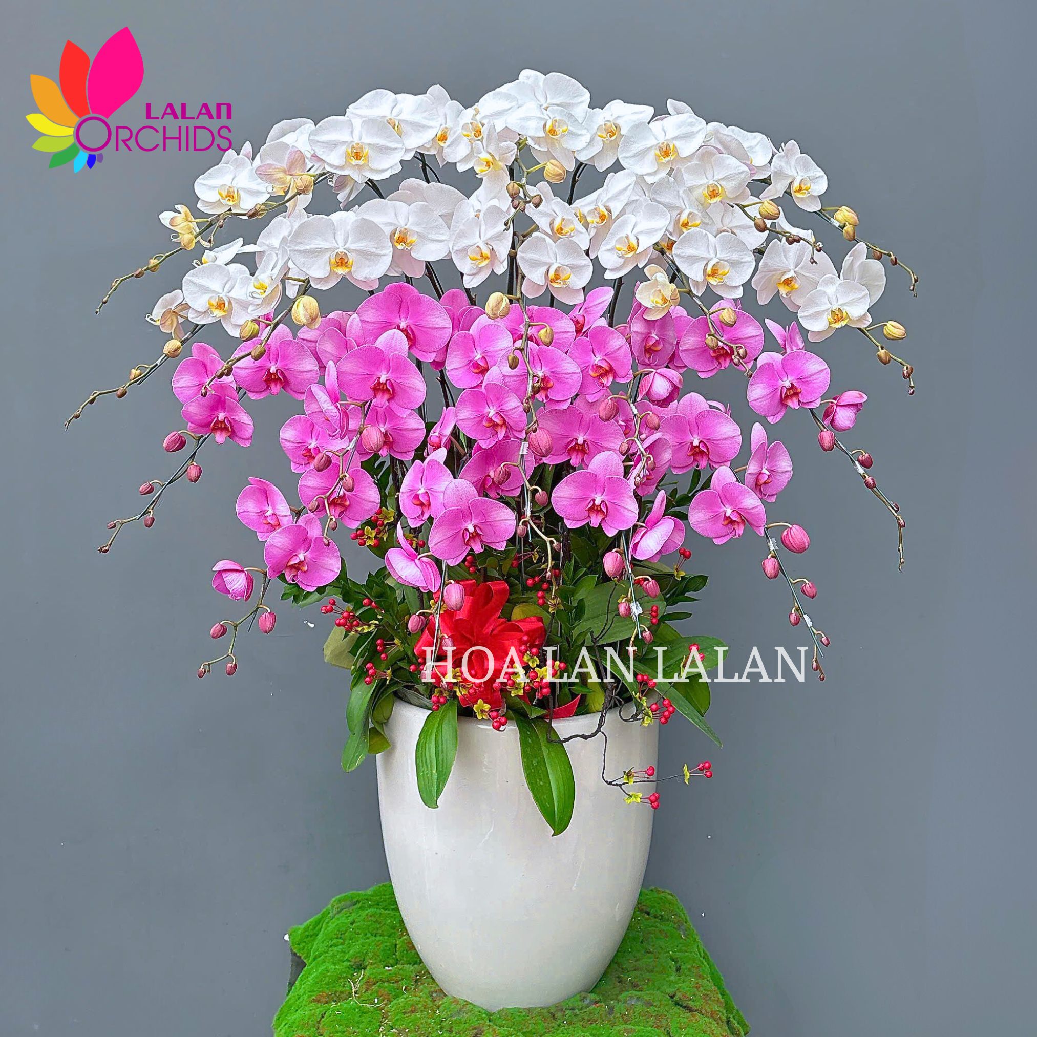 Tựa như khúc nhạc giao hòa giữa sự tinh khôi và ngọt ngào, chậu lan hồ điệp mix trắng hồng mang đến vẻ đẹp trong sáng, nhẹ nhàng mà sang trọng đến lạ. Lan hồ điệp trắng tinh khôi biểu trưng cho sự thuần khiến và trong sáng trong tâm hồn, lan hồ điệp hồng lại mang đến niềm hân hoan, hạnh phúc viên mãn. Khi hai sắc lan hồ điệp trắng hồng kết hợp như đang kể lại câu chuyện về tình yêu, niềm vui và sự bình yên trong cuộc sống.