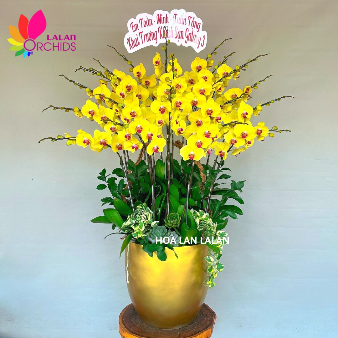 Chậu lan hồ điệp màu vàng được ghép từ những cành hoa lan chất lượng loại A với đặc điểm bông to, cành dài, siêu bền, do các nghệ nhân của Hoa lan Lalan ghép xen kẽ một cách hài hòa, nghệ thuật tạo nên chậu hoa lan đẹp sang trọng, quý phái và tinh tế.