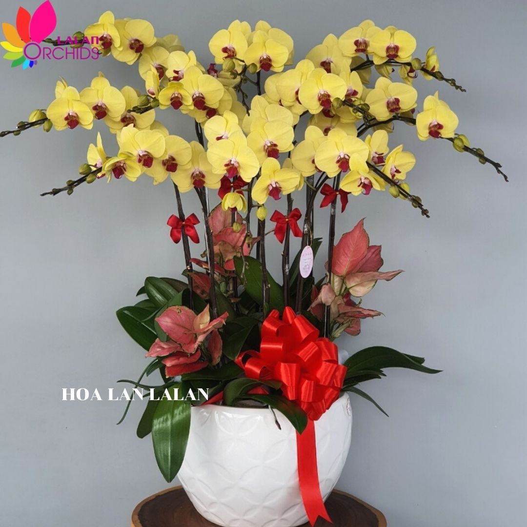 Chậu hoa lan hồ điệp nắng vàng kết hợp từ 10 cành lan hồ điệp màu vàng cùng với cây vạn lộc đỏ, được những người thợ có tay nghề cao của Hoa lan Lalan thiết kế một cách tỉ mỉ và nghệ thuật, tạo nên chậu lan hồ điệp sang trọng, quyến rũ và tinh tế.