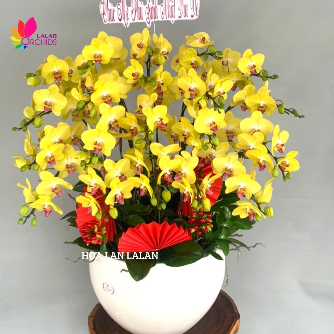 Chậu lan hồ điệp tặng sinh nhật 20 cành vàng được các nghệ nhân của Hoa lan Lalan ghép xen kẽ một cách hài hòa, nghệ thuật tạo nên chậu hoa lan đẹp sang trọng, quý phái và tinh tế.