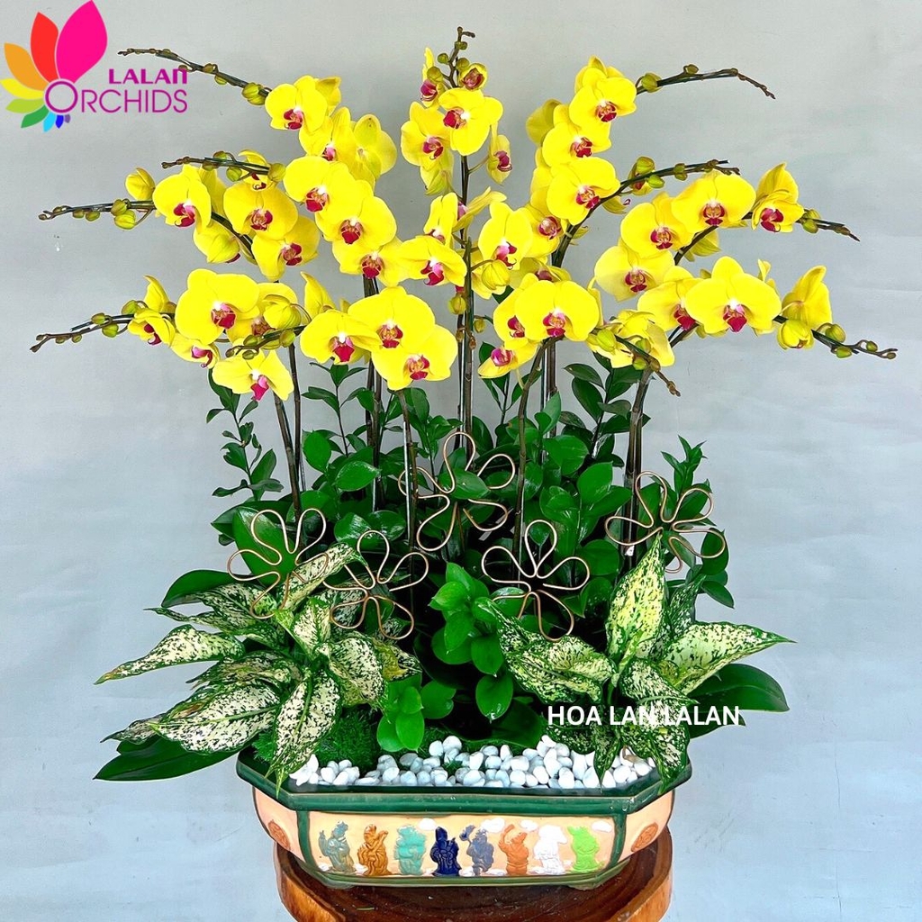Lan hồ điệp tết màu vàng được các nghệ nhân của Hoa lan Lalan ghép xen kẽ một cách hài hòa theo nghệ thuật bonsai, tạo nên chậu hoa lan đẹp sang trọng, quý phái và tinh tế.