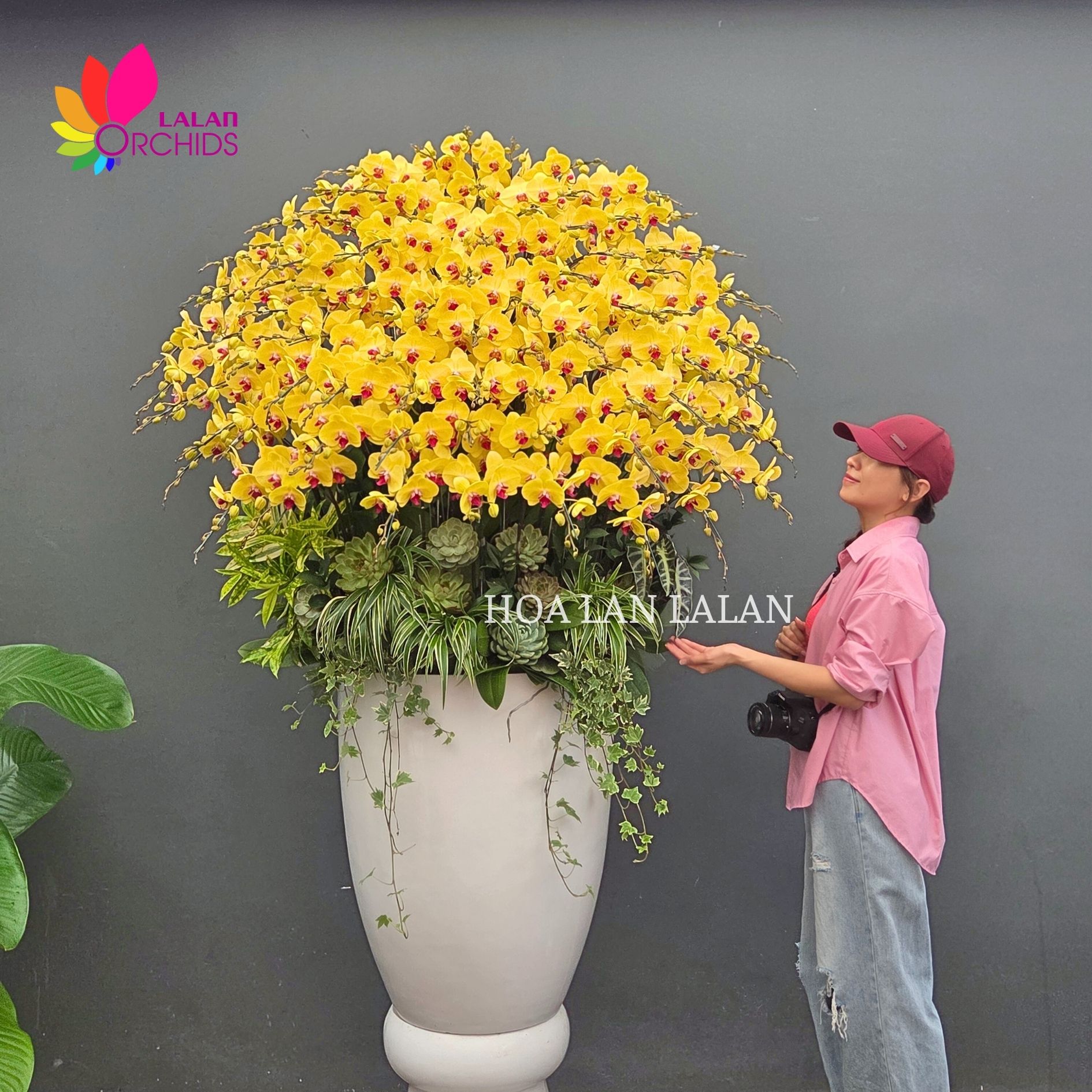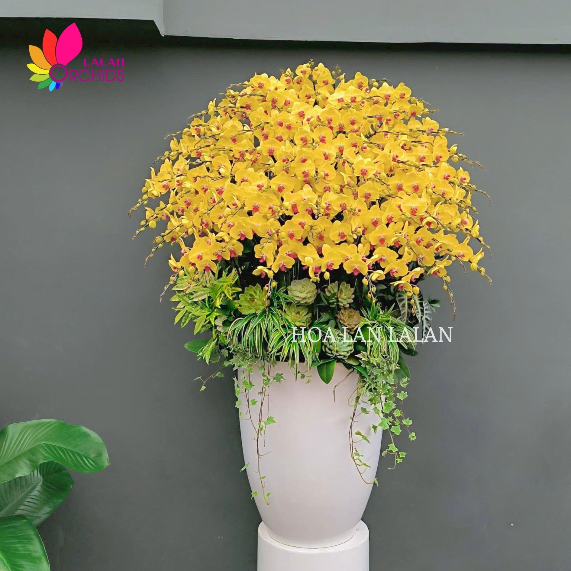 Chậu lan hồ điệp Tết vàng rực như ánh nắng đầu xuân, mang theo trọn vẹn năng lượng cát tường và tài lộc cho năm mới. 90 cành lan hồ điệp được khéo léo, hài hòa, tạo nên dáng hoa tròn đầy, viên mãn, biểu tượng của sung túc, đủ đầy và khởi đầu hanh thông. Sắc vàng tươi của hoa lan hồ điệp Tết lan tỏa cảm giác ấm áp, phấn khởi, gợi mở một năm mới phát đạt và hưng thịnh.