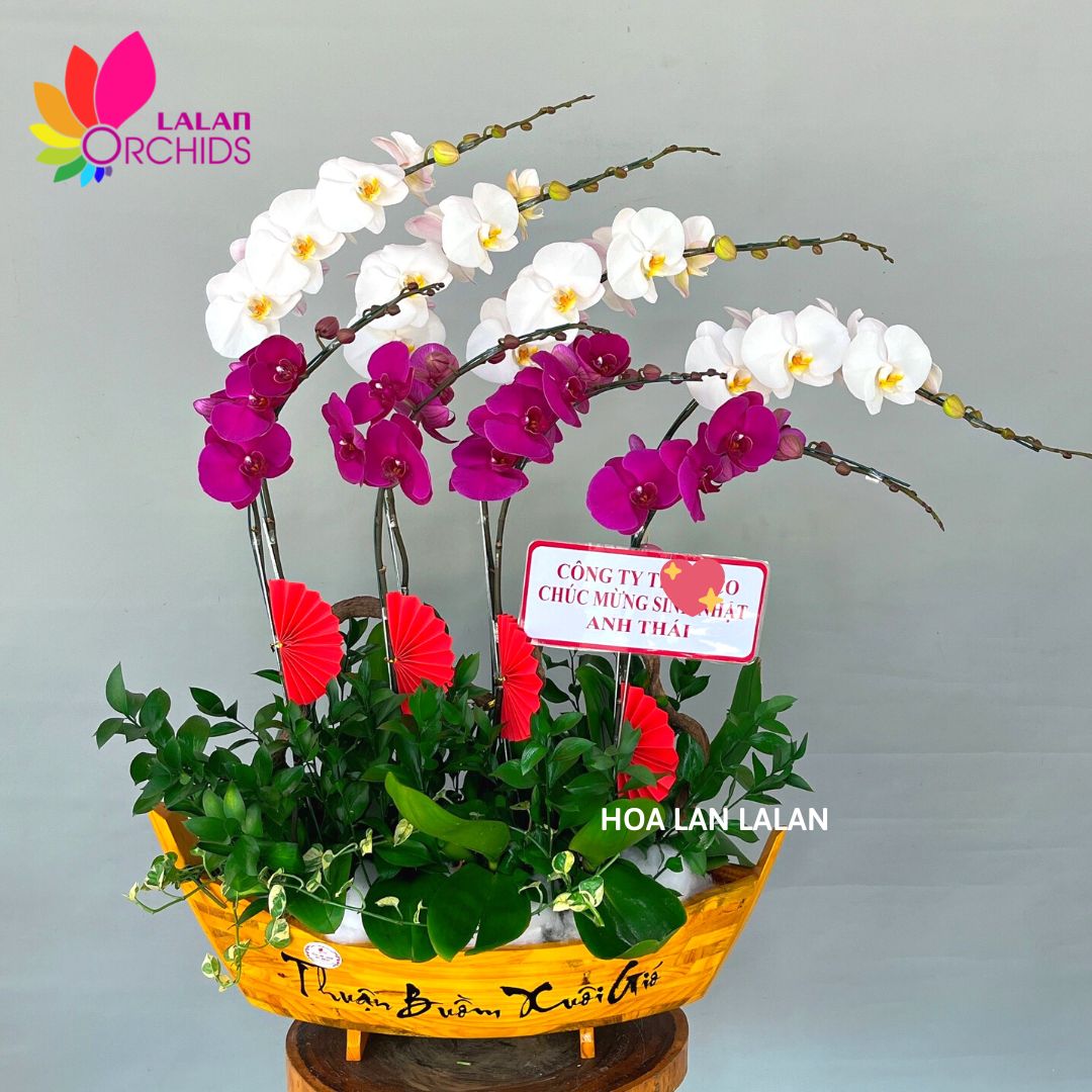 Thuyền lan hồ điệp trắng tím, được kết hợp từ 8 cành lan hồ điệp và thuyền gỗ, là hình tượng biểu trưng cho lời chúc thuận buồn xuôi gió đến người được tặng.