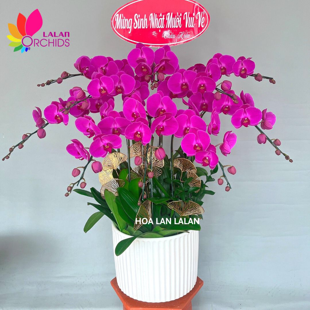 Chậu lan hồ điệp tím 10 cành được các nghệ nhân của Hoa lan LaLan thiết kế một cách hài hòa, độc đáo, tạo nên tác phẩm đẹp, sang trọng và thu hút mọi ánh nhìn.