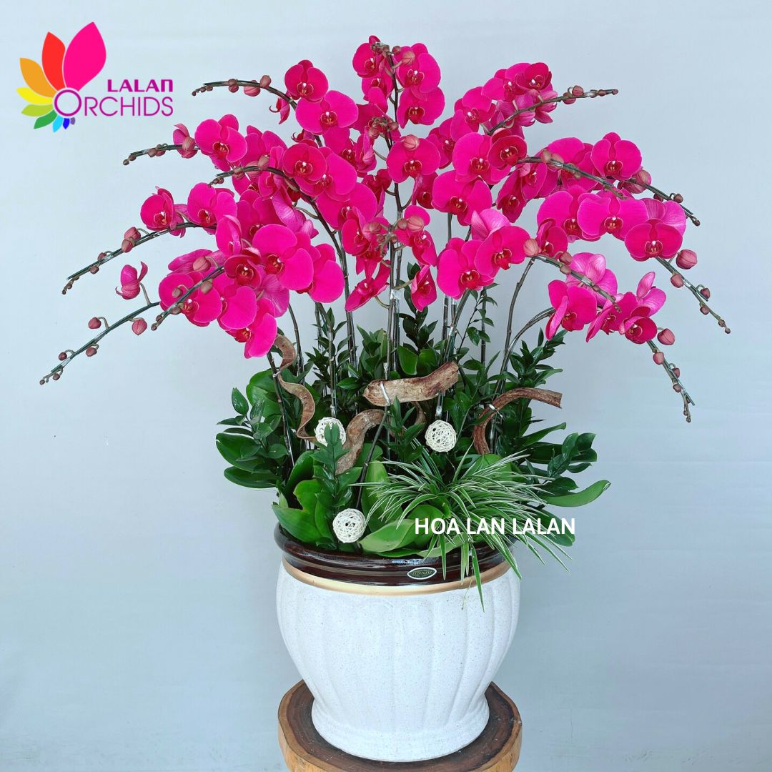 Chậu lan hồ điệp tím 15 cành ghép từ những cành hoa lan chất lượng loại A với đặc điểm bông to, cành dài, siêu bền, được các nghệ nhân của Hoa lan Lalan ghép xen kẽ một cách hài hòa, nghệ thuật tạo nên chậu hoa lan đẹp sang trọng, quý phái và tinh tế.
